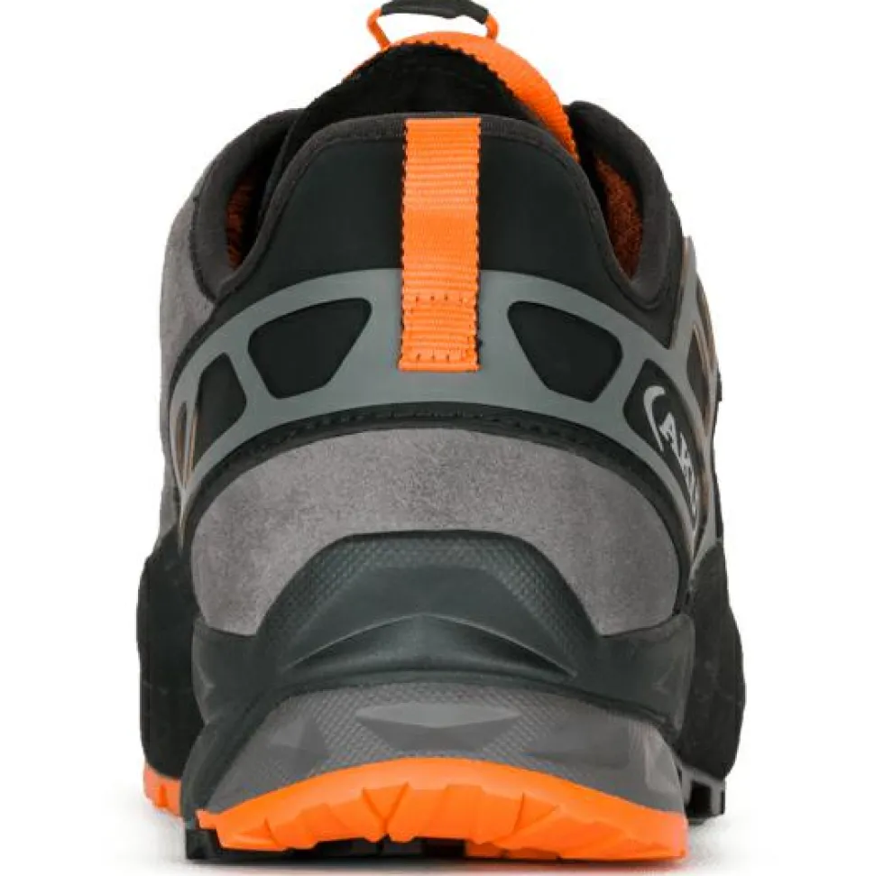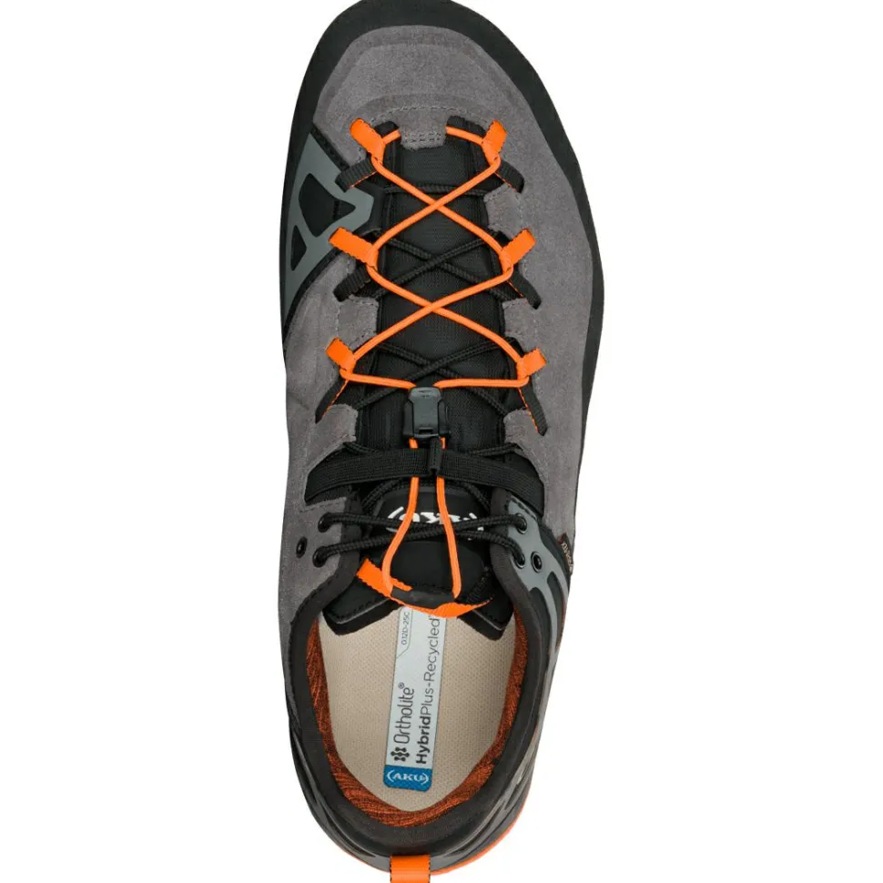 Die Rock DFS II GTX Schuhe sind mit einer asymmetrischen Zwischensohle aus EVA und PU ausgestattet, die das AKU Elica Natural Stride System nutzt, um die biodynamische Effizienz zu fördern. Die abriebfeste Oberseite aus Wildleder, Stoff und Mikrofaser wird durch einen Gummischutz ergänzt, der die Schuhe beim Klettern schützt. Die Vibram Approcciosa Sohle mit Megagrip-Mischung bietet maximalen Halt und ist speziell für das Klettern konzipiert.