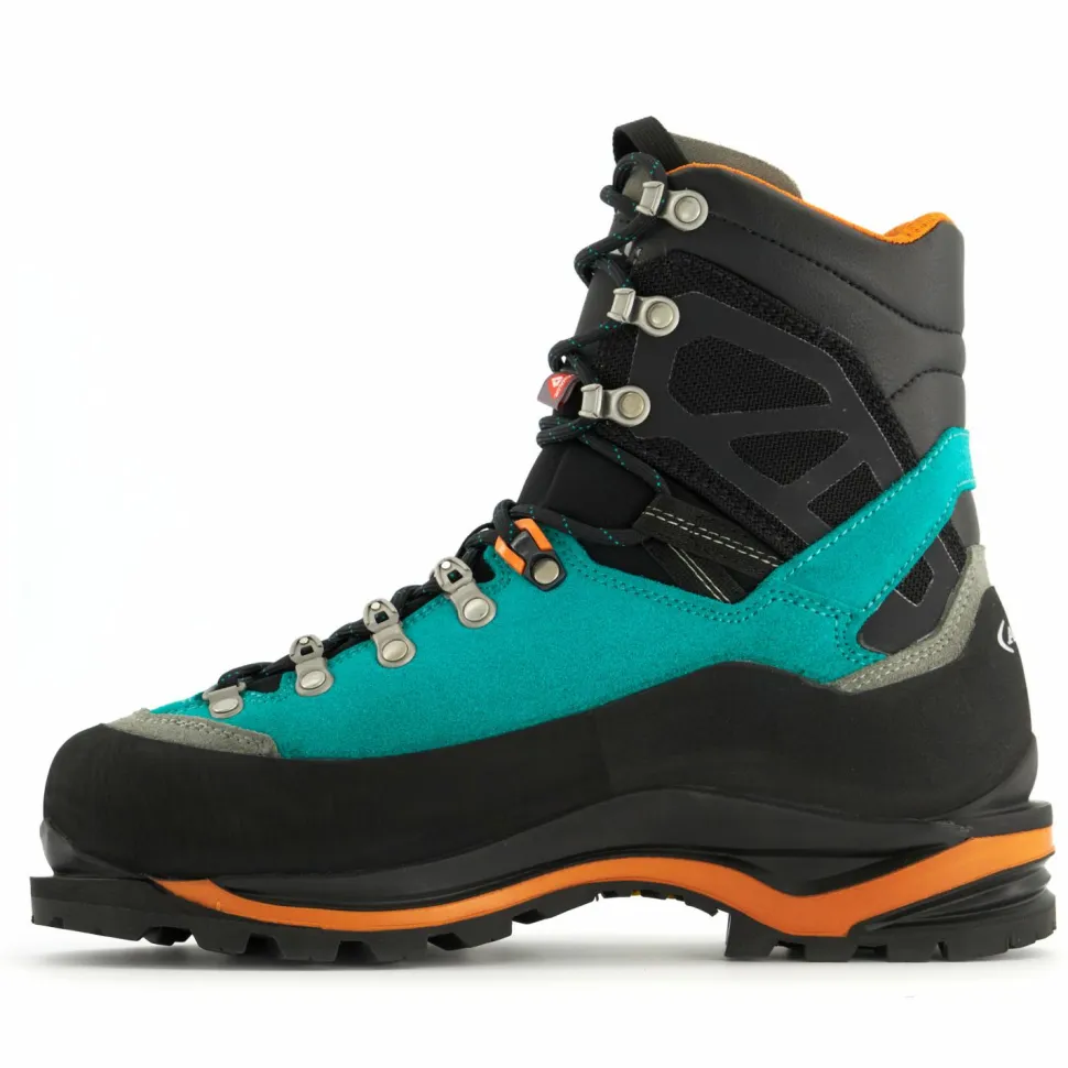 Der erste 4000er Gipfel oder eine Bergtour in anspruchsvollem Gelände? Dafür ist der Women’s Hayatsuki GTX von AKU wie gemacht! Der Bergschuh überzeugt mit Robustheit und praktischen Features für Alpinistinnen. Dank GORE-TEX ist der Schuh wasserdicht und atmungsaktiv, was ein angenehmes Klima am Fuß begünstigt. Die zusätzliche Fütterung mit Primaloft ist vor allem bei niedrigen Temperaturen am Berg vorteilhaft. Damit man auch im Geröll gut geschützt wird, kommt der Schuh mit Geröllschutzrand und verstärkten Zehen sowie Fersen. Das gibt auch Stabilität und Halt. Sobald es eisig wird, lassen sich Steigeisen problemlos am Hayatsuki befestigen.