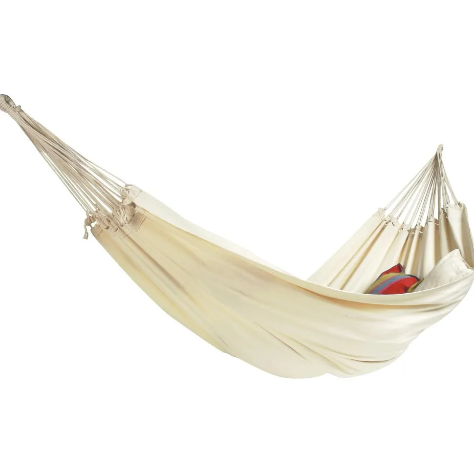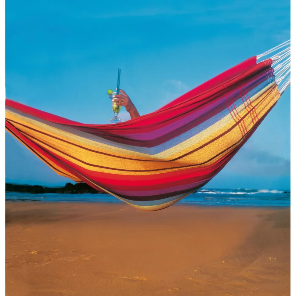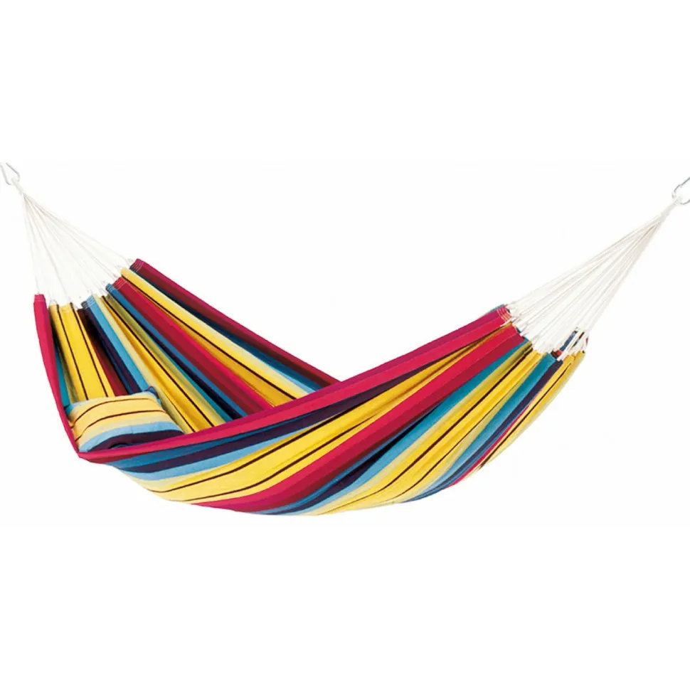 Die breite Barbados Hängematte von Amazonas lädt für das Schaukeln zu zweit oder alleine ein. Mit ihrer Tragkraft von bis zu 200 kg hält sie das problemlos aus. Ihr könnt sie im Garten, im Park, oder aber auch bei Euch im Wohnzimmer aufhängen.