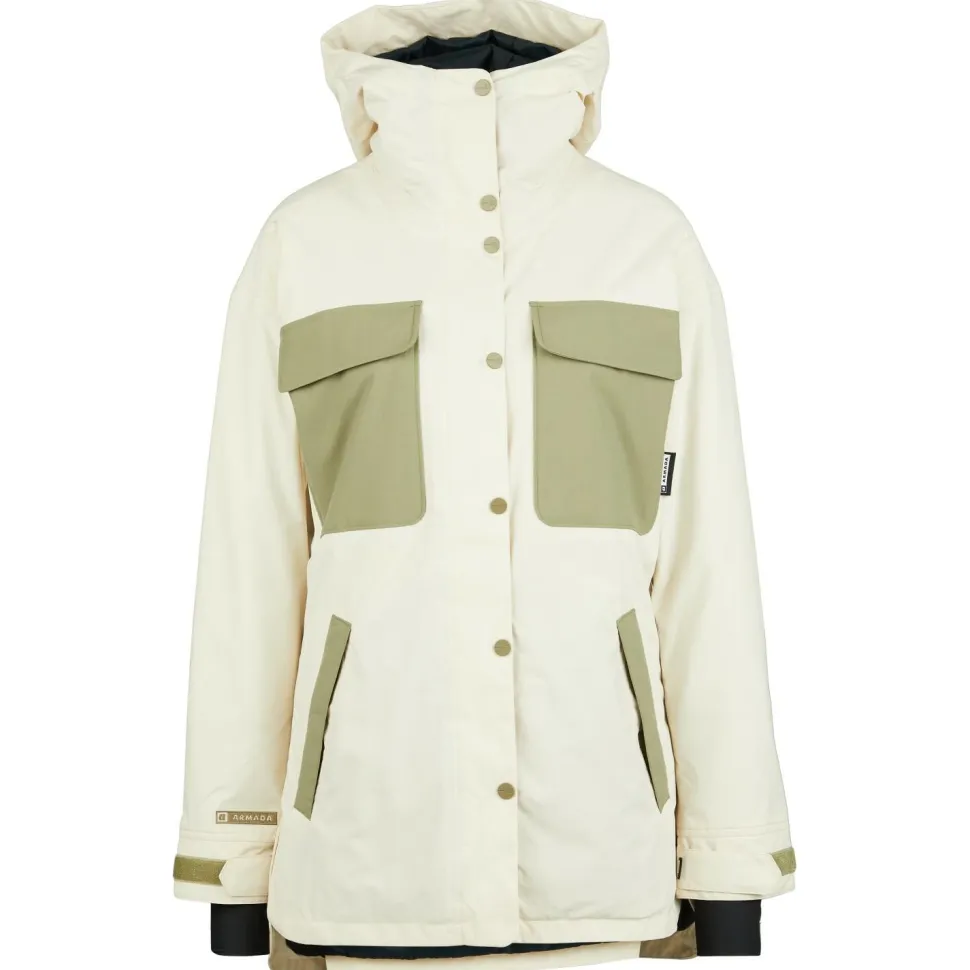 Der praktische Schneefang lässt sich individuell verstellen und verfügt über einen 4-Wege-Stretch für mehr Bewegungsfreiheit und Komfort. Mehrere Taschen, unter anderem die lässigen Cargo-Taschen auf der Brust, lassen alle wichtige Utensilien sicher und leicht erreichbar verstauen. Der hinten etwas länger Schnitt verleiht der Jacke einen besonders coolen Look. Die Women’s Rhye 2L Insulated Jacket von Armada lässt sich durch Druckknöpfe mit der Hose verbinden – einfach genial.