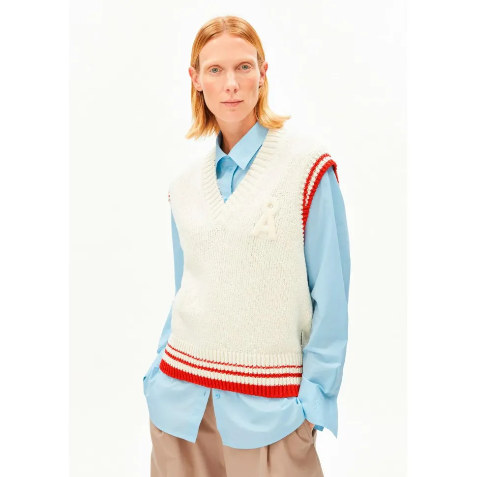 Du kannst den Pullover über einem T-Shirt oder Longsleeve tragen. Damit ist er ein echter Allrounder für viele unterschiedliche Unternehmungen. Ein Pullover, der alle Blicke auf sich zieht – der Women’s Iconic Å College Knit Vest von ARMEDANGELS.