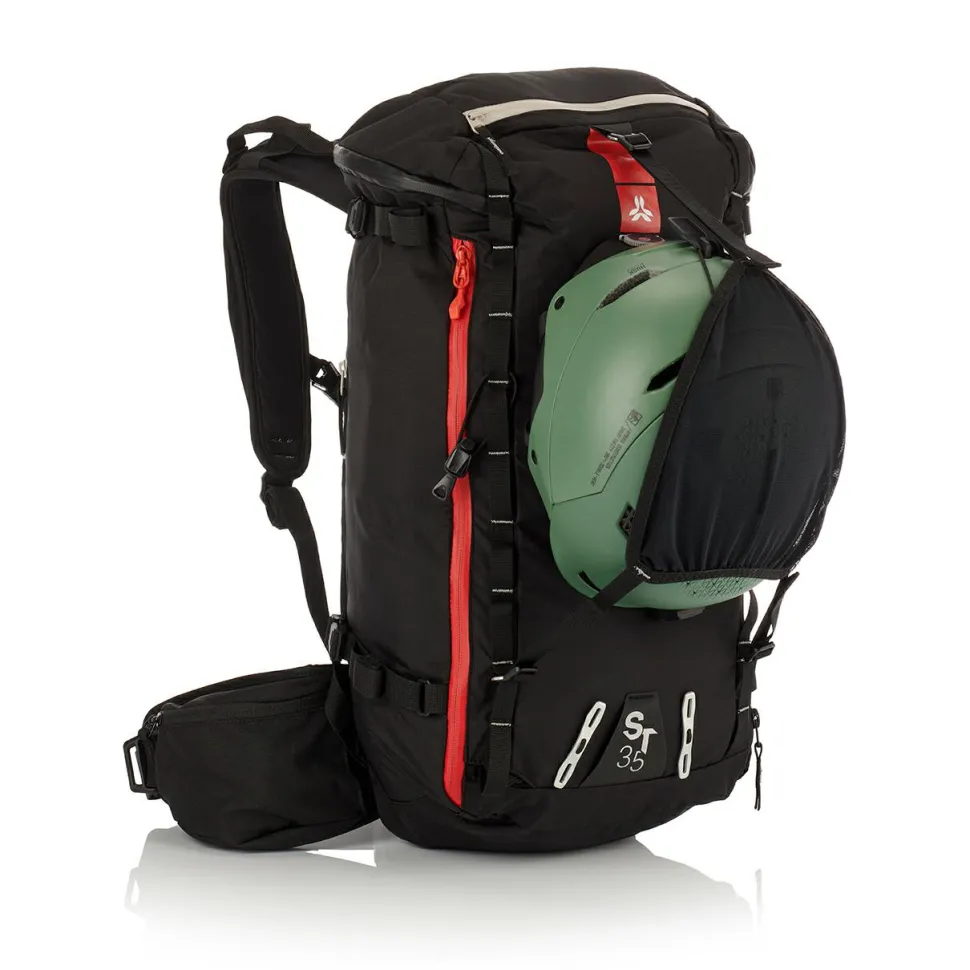 Der ST 35 ist kompatibel mit Hydratationssystemen und verfügt über einen Schlauchschutz im Schultergurt. Ein integrierter Helmhalter, Daisy-Chain-System und Befestigungsmöglichkeiten für Ski (A-Frame oder diagonal), Snowboard und Schneeschuhe machen ihn extrem vielseitig. Zusätzliche Taschen für Sicherheitsausrüstung und kleine Wertsachen sowie ein Brustgurt mit Signalpfeife runden das Paket ab.