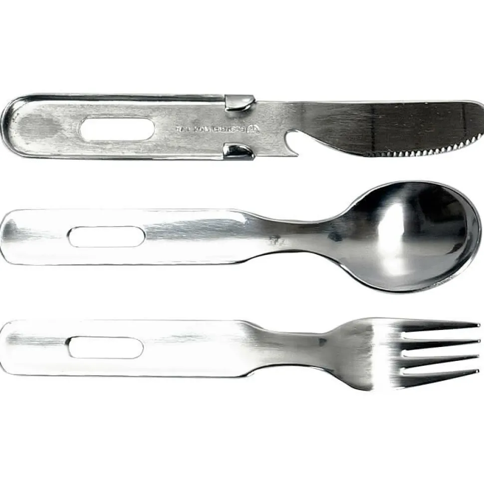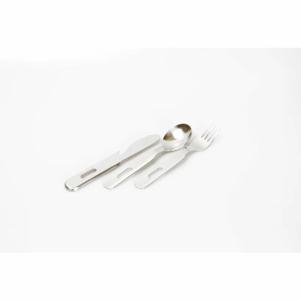 Schön kompakt und beim Essen immer schnell zur Hand: Das Biwak Trekking Besteck von Basic Nature. Es besteht aus rostfreiem Edelstahl und kann einfach ineinander gesteckt werden. Es besteht aus Gabel, Löffel und Messer – alles, was man für ein ausgiebiges Mahl braucht!