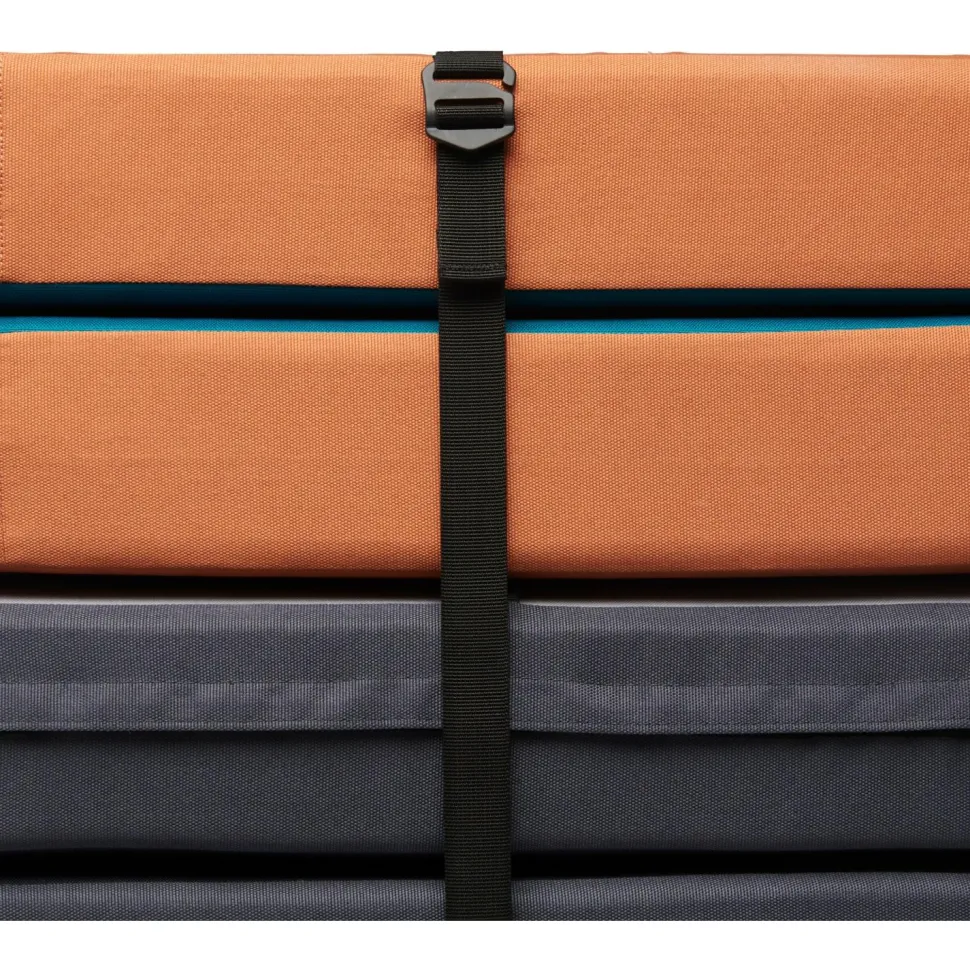 Das Crashpad kommt als zweilagige, 10 cm dicke Konstruktion aus einem geschlossenzelligen PE-Schaumstoff an der Oberseite und einem dichten PU-Material an der Unterseite. Die Matte dämpft die Aufprallenergie ab und mindert das Verletzungsrisiko, wenn es zum Sturz kommt. Die Matte ist mit einem robusten Nylongewebe bezogen, das richtig was aushält. Zum Transport lässt sich die Matte problemlos zusammenklappen und per Schnallensystem sicher verpacken. Tipptopp!