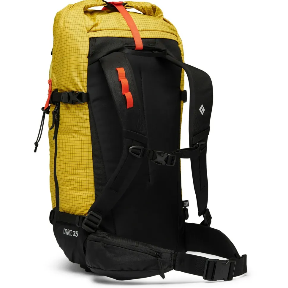 Black Diamond fertigt den leichten und robusten Cirque 35 aus Nylongewebe mit Dynex Verstärkung. Der Rucksack verfügt über ein extra Fach für die LVS-Ausrüstung und ist mit Befestigungsmöglichkeiten für Eispickel, Eisgeräte, Skihelm und Kletterseil ausgestattet. Auch ein Trinksystem lässt sich einfach installieren. Ein gepolstertes und atmungsaktives Tragesystem, seitliche Kompressionsriemen und seitlich weit zu öffnende Reißverschlüsse machen den Skitourenrucksack bereit für den Einsatz im Backcountry.
