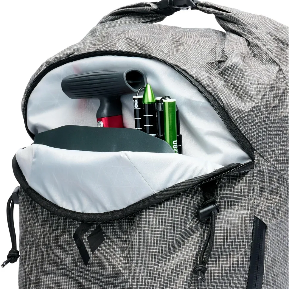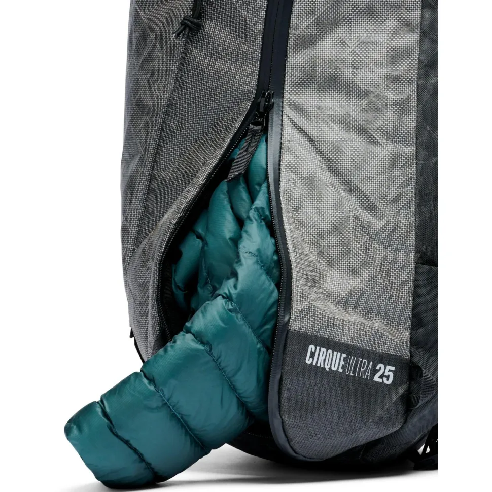 Zu den spezifischen Details gehören der diagonale Skitragegurt, die Micro PickPockets für die problemlose Befestigung jedes Eispickels und die schnell zugängliche Außentasche für Lawinenausrüstung, die mit einem beschichteten Reißverschluss geschützt ist. Seitliche Fächer für Felle und Steigeisen sind von außen zugänglich und auch das Hauptfach ist mit dem Seiten-RV jederzeit schnell erreichbar. Damit ist der Cirque Ultra 25 einer der leichtesten und dennoch best ausgestatteten Skitourenrucksäcke überhaupt!