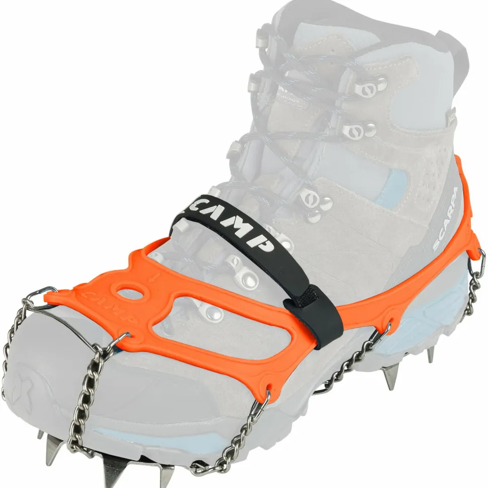 Die Grödel lassen sich bei Bedarf rasch über Deine Bergschuhe oder Winterstiefel ziehen und sitzen durch das flexible Gummiband sicher am Schuh. Ein anpassbarer Klettverschluss auf der Oberseite ermöglicht eine zusätzliche Fixierung, damit die Ice Master Evo von Camp in steilem Gelände nicht vom Schuh rutschen.