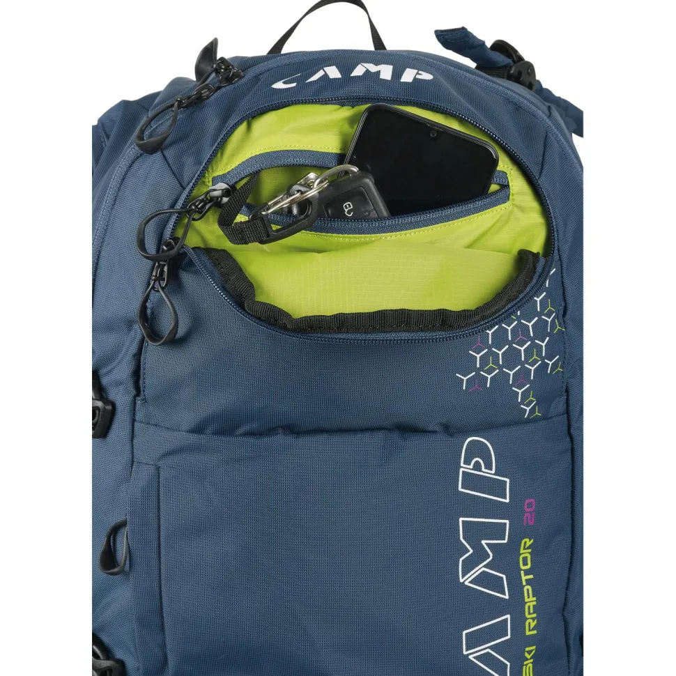 Das ergonomisch geformte Rückenteil ist aus besonders atmungsaktivem Mesh-Gewebe konstruiert und leitet Feuchtigkeit gezielt nach außen hin ab. Das Steigeisenfach des Skitourenrucksack lässt sich über einen Reißverschluss auf der Innenseite mit dem Hauptfach verbinden. Mehrere Materialschlaufen an den Schulterträgern sowie am Hüftgurt machen den Camp Ski Raptor 20 zur ersten Wahl für die nächste Bergtour.