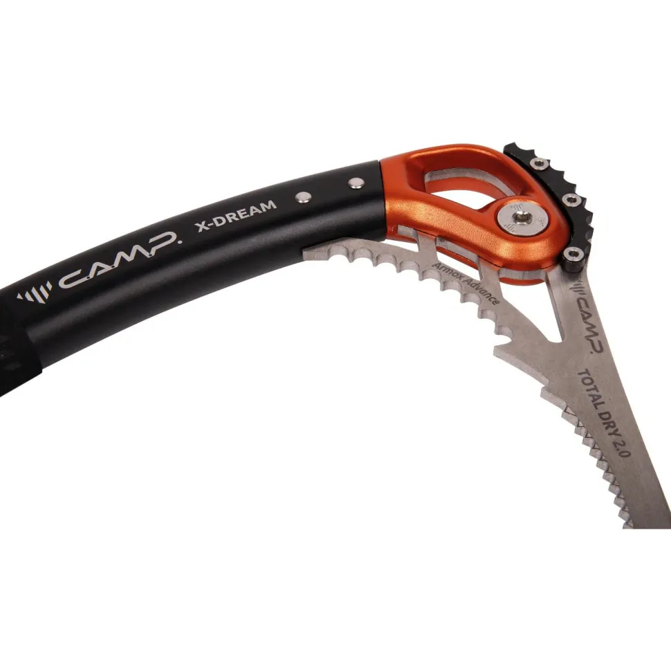 Das X-Dream Total Dry von C.A.M.P. ist ein Eisgerät, das für Drytooling und Wettkämpfe die maximale Leistung garantiert! Seine Abmessungen entsprechen den UIAA-Bestimmungen für Drytooling- und Eiskletterwettkämpfe. Die hier mitgelieferte Total Dry 2.0 Haue zeichnet sich durch ein besonders aggressives Design aus und erreicht dank ihres ballistischen Armox Advance-Stahls eine extreme Härte von über 60 HRC mit unübertroffener Bruchfestigkeit. Der Total Dry-Griff verfügt über ein verlängertes Design für einen schnellen und effizienten Handwechsel und um entfernte Placements besser zu erreichen. Er ist in einem idealen Winkel zum Einhängen und Ziehen an Felsen und künstlichen Strukturen angebracht.