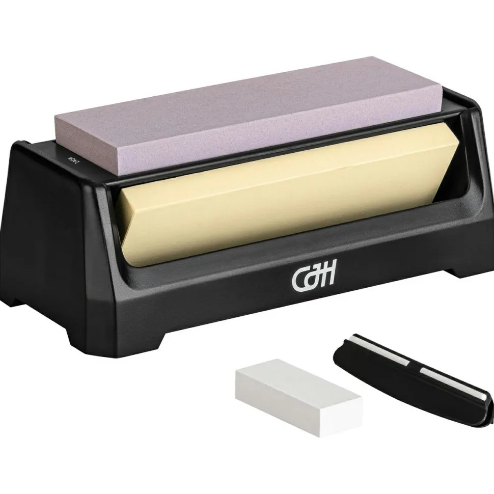 Mit dem dreiseitigen Korund-Wasserstein von Herbertz bekommst Du Deine Messerklingen auf jeden Fall rasiermesserscharf! Die drei jeweils 24 cm langen Schleifsteine kommen in den Körnungen 240, 1000 und 3000. Aufgehängt sind die drei Steine in einem robusten Plastikgehäuse, und Du kannst den Stein mit der jeweils benötigten Stärke nach oben drehen, um ihn zu benutzen.