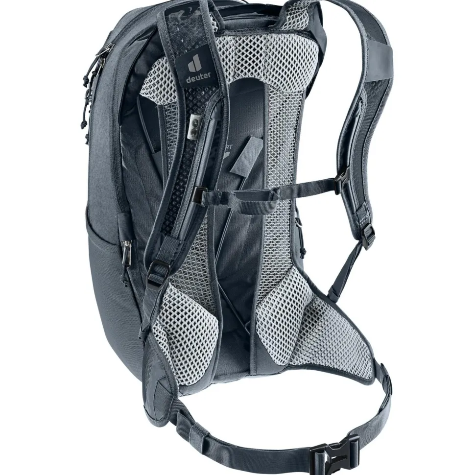 Durch das bequeme Aircomfort Tragesystem von deuter sorgt der Race Air 14 + 3 Bike-Rucksack bei jeder Ausfahrt mit dem Rad für hohen Tragekomfort. Die ergonomisch geformten Hüftgurtflossen passen sich an Deine Taille an und engen Dich beim Mountainbiken nicht ein. Das atmungsaktive Mesh-Gewebe leitet Feuchtigkeit rasch nach außen hin ab. Das Werkzeugfach auf der Vorderseite lässt sich über einen Reißverschluss erreichen und erleichtert Dir unterwegs die Reparaturen am Bike.