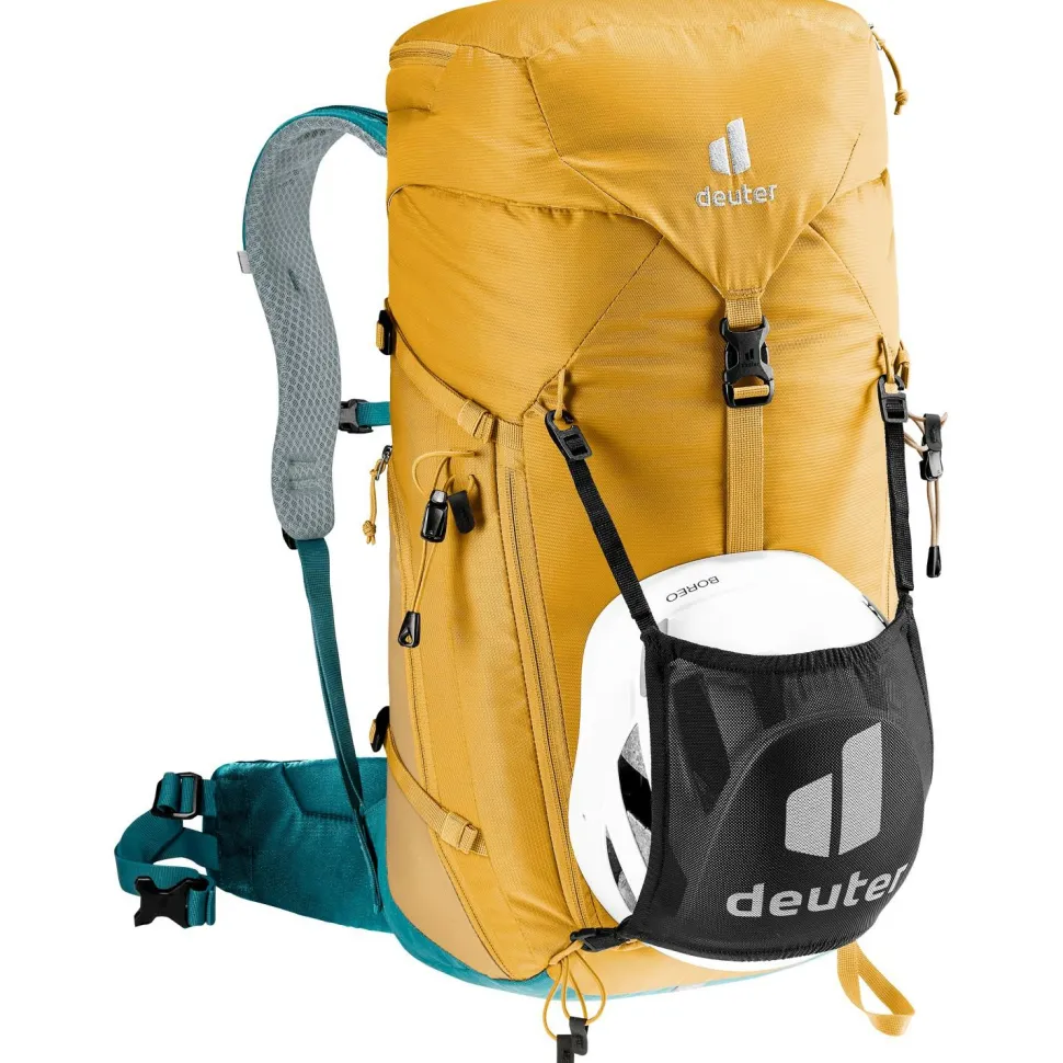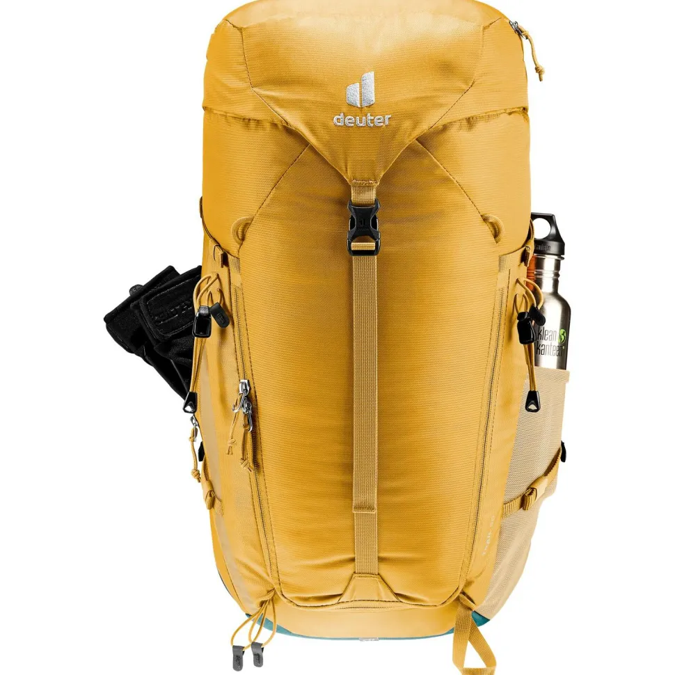Die beiden elastischen Seitentaschen eignen sich ideal für den Transport von Trinkflaschen. Dank der abnehmbaren Regenhülle aus hellem Material bist Du bei Regen optimal geschützt. Durch die seitlichen Riemen lässt sich der Rucksack bequem komprimieren. Das Wertsachenfach im Inneren verfügt über einen abnehmbaren Clip für Deinen Hausschlüssel. Der Trail 30 Wanderrucksack von deuter ist zum Teil aus recyceltem Material hergestellt.