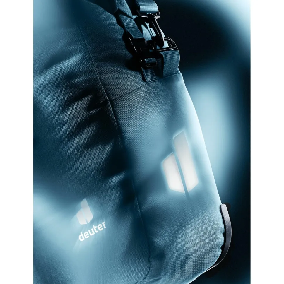 Mit den reflektierenden Elementen ist sie auch bei schlechtem Wetter oder in der Dämmerung gut für andere Verkehrsteilnehmerinnen sichtbar.Der Umwelt zuliebe hat deuter Wert auf recycelte Fasern gelegt.