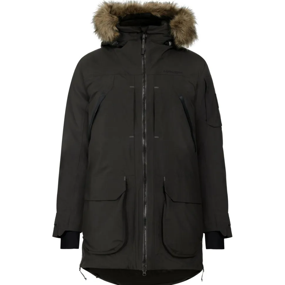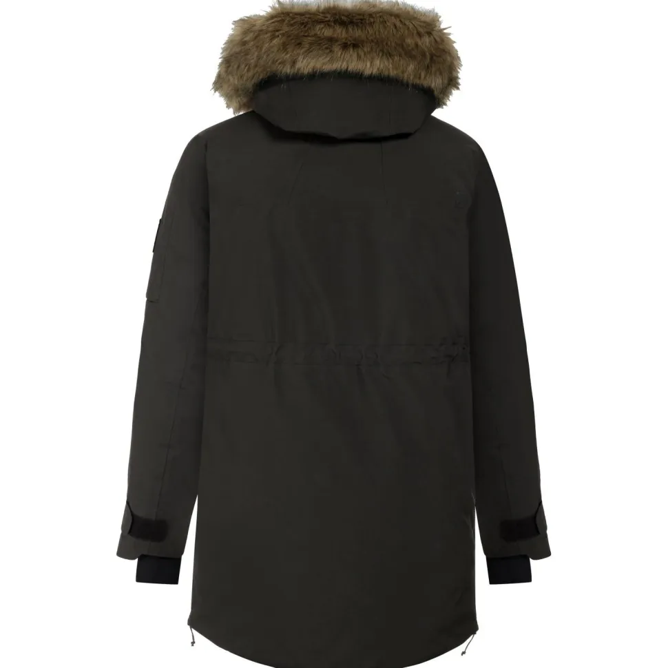 Die Kapuze ist zweifach verstellbar und sorgt mit einem abnehmbaren Kunstpelz für ein optisches Highlight. Der Sitz an der Hüfte ist am Rücken verstellbar. Die Ärmelabschlüsse lassen sich per Klettverschluss regulieren und sind an der Innenseite elastische eingefasst und mit praktischen Daumenlöchern versehen. Ordentlich viel Taschen für den nötigen Stauraum sind natürlich auch dabei. Stark!