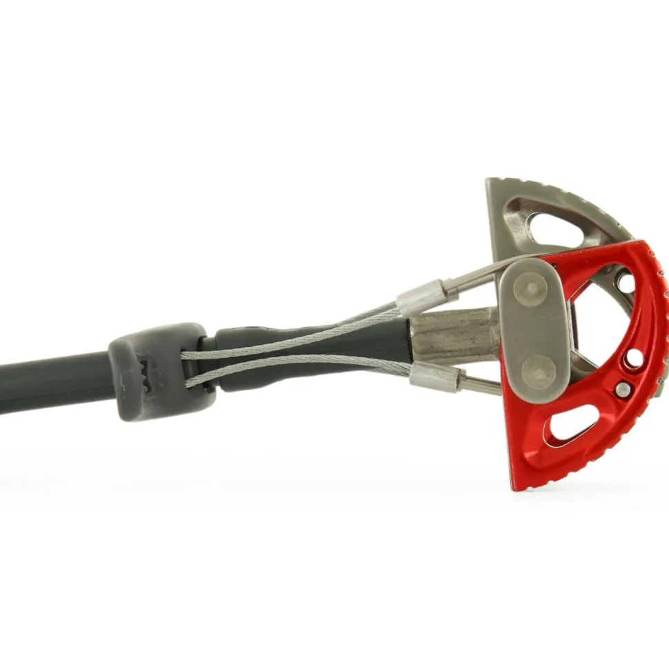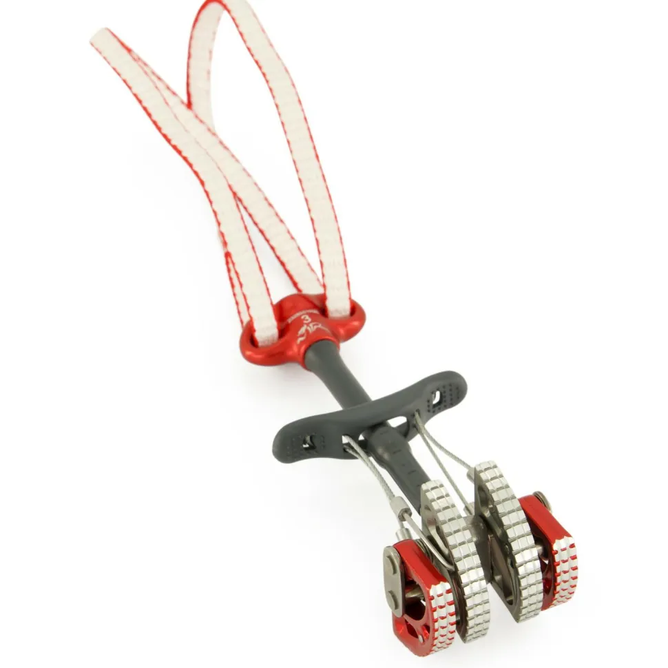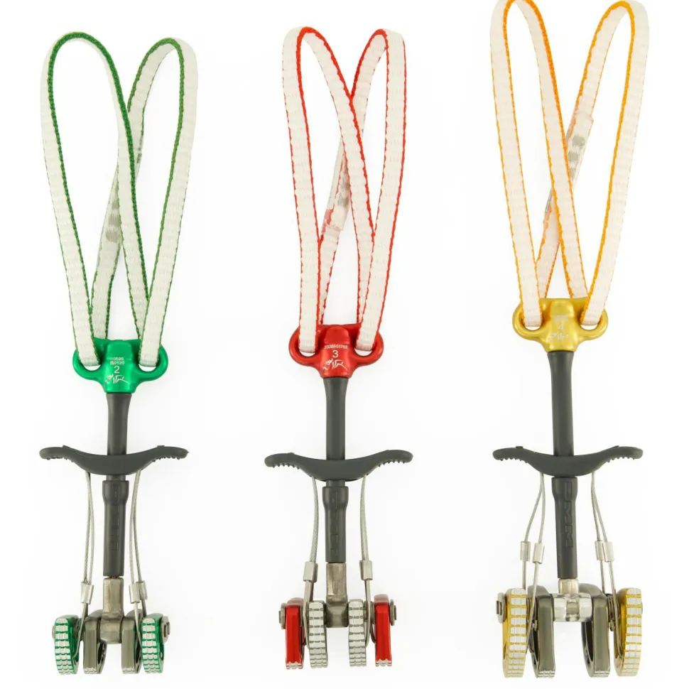 Der Dragon 2 ist ein aktives Klemmgerät mit Doppelachs-System und einfachem Steg. Diese Konstruktion wiegt weniger als ein Zwei-Stege-Klemmgerät und bietet ebenfalls den Vorteil einer passiven Platzierungsmöglichkeit (Cam wird wie ein Klemmkeil gelegt, nicht aktiv in Spalt gesetzt). Das Highlight des Dragon 2 sind ohne Zweifel die heißgeschmiedeten Klemmsegmente. Die Oberfläche ist im Kontaktbereich zum Fels CNC-gefräst und mit einer Triple Grip Struktur versehen. Dadurch finden die Segmente in kleinsten Felsstrukturen Halt und wandern nicht so leicht im Riss. Die 8 mm Dynatec Schlinge lässt sich wahlweise kurz oder lang verwenden. Das hat zwei Vorteile: zum einen kann man Expressen direkt in die Schlinge einhängen und so Expressen sparen. Gleichzeitig kann man seine Zwischensicherungen verlängern, um den Seilverlauf zu begradigen. So spart man das entscheidene Gewicht in schwierigen Tradrouten und langen Alpintouren!
