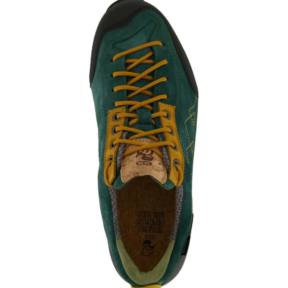 Wasserdichte Approachschuhe aus nachhaltigen Materialien – das sind die Ginja Rock WP von Doghammer. Die halbhohen Schuhe machen sowohl auf Wanderungen als auch beim Aufstieg zur Kletterwand eine gute Figur. Dank des wasserdichten Innenfutters kannst Du Kletterherausforderungen trockenen Fußes angehen. Die EVA Zwischensohle sorgt dabei in Kombination mit dem Fußbett mit Kork für den nötigen Tragekomfort. So kommst Du ausgeruht an der Wand an. Mit den praktischen Anziehschlaufen bieten Dir die Ginja Rock WP von Doghammer eine einfache Befestigungsmöglichkeit während des Kletterns.