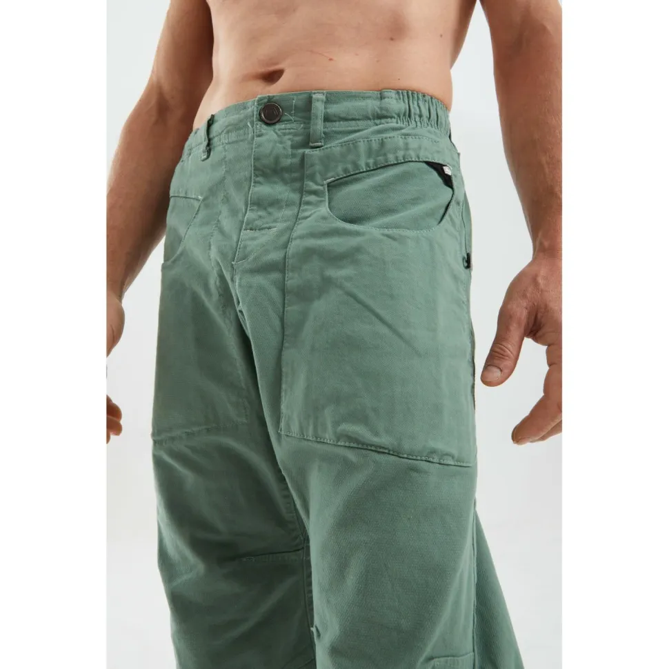 Die E9 Blat2 Boulderhose bietet praktische Aufbewahrungsmöglichkeiten. Der Knopfverschluss und der Front-RV erleichtern das An- und Ausziehen. Zwei Fronttaschen bieten Platz für kleine Gegenstände, und die Gesäßtasche ist ideal für alles, was sicher verstaut werden muss.