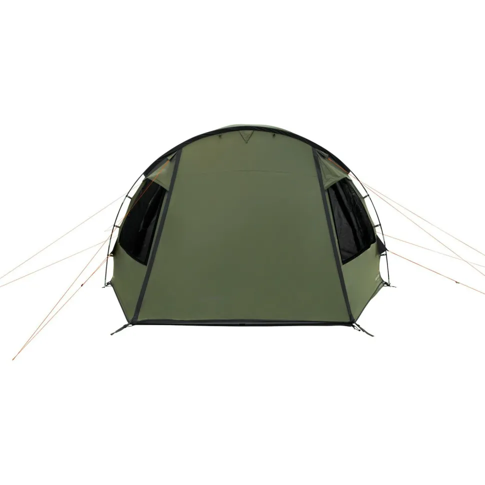 Platz für die Familie oder einen Teil der Jugendgruppe bietet das Kinn 5 von Easy Camp. Dieses Gruppenzelt eignet sich für Campingurlaube und Zeltlager bestens. Durch seine Konstruktion als Kuppelzelt steht es auch bei stärkerem Wind sicher. Darüber hinaus ist es in Teilen freistehend und kann notfalls auch ohne zusätzliche Ankerpunkte aufgestellt werden. Allerdings entfällt dann die Apsis. Die Außenhaut ist dabei wind- und wasserdicht, auch anhaltender Niederschlag kann dem Zelt nichts anhaben. Zusätzlich sorgen der eingenähte Boden und die Zeltunterlage für das Vorzelt dafür, dass keine Nässe von unten her ins Zelt eindringen kann.
