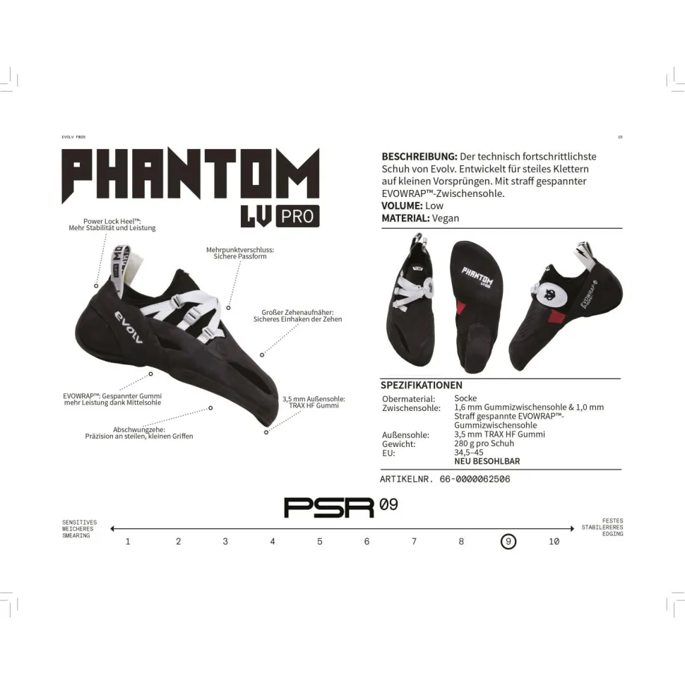 Mit den Phantom Pro LV-Kletterschuhen von Evolv bekommst Du ein Werkzeug für anspruchsvolle Routen und kleine Tritte. Die Low Volume-Version ist ideal für schmale Füße oder für alle, die ein besonders spannungsreiches Tragegefühl bevorzugen. Dank der EVOWRAP™-Zwischensohle wird die Kraft optimal auf den Vorderfuß übertragen – perfekt für steile Wände und präzises Antreten. Die 3.5 mm Evo-74-Gummisohle bietet Dir maximale Reibung und Kontrolle, selbst auf kleinsten Strukturen.
