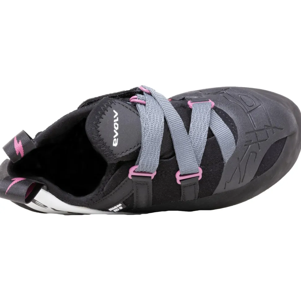 Die Shaman Pro LV (LV = Low Volume) von Evolv sind schmal geschnittene Kletterschuhe, die sich hervorragend zum anspruchsvollen Bouldern oder auch zum Klettern an steilen Indoor-Wänden eignen. Das Besondere an diesen Schuhen ist das ausgeklügelte Verschlusssystem, mit dem sich die Passform flexibel und präzise einstellen lässt.