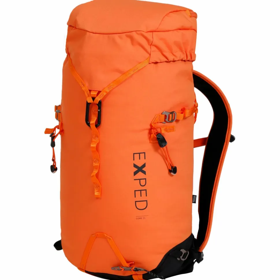 Exped konstruiert den Core 25 als klassischen Toploader mit extra Deckelfach und praktischen Befestigungsmöglichkeiten. Dazu gehören Fixpunkte für Eisgeräte oder Trekkingstöcke, eine Daisychain auf der Front und eine Flaschenhalterung auf der Innenseite. Auch Trinksysteme lassen sich mühelos in den Rucksack integrieren. Der Core 25 wird aus recycelten Materialien gefertigt und ist PFC-frei und bluesign zertifiziert.