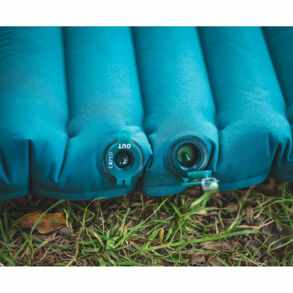 Die vertikalen Kammern sorgen für ein angenehmes Liegegefühl und sind mit einer leichten, bluesign zertifizierten Mikrofaser Isolation wattiert. Das schließt besonders viel isolierende Luft ein und dämpft effektiv die Kälte, die vom Boden ausstrahlt ab. Befüllt wird die Matte durch ein leicht bedienbares Flachventil. Die mitgelieferte Schnozzel Pumpag erlaubt Euch zudem ein schnelles Aufpumpen ganz ohne den Einsatz von Lungenkraft, was zudem der Bildung von Feuchtigkeit im Matteninneren vorbeugt. Zum Transport oder zu Lagerung lässt sich die Dura 5R zudem auf ein kompaktes Packmaß reduzieren. Klasse!