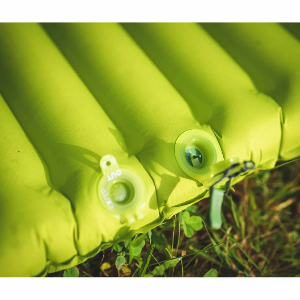 Die Isomatte ist aus einem strapazierfähigen Ripstop-Gewebe aus recyceltem, Oeko-Tex zertifiziertem Polyestergewebe gefertigt. Im Inneren der Matte sorgt eine leichte Texpedloft-Kunstfaserwattierung für einen hohen Lufteinschluss und somit für leistungsstarke Isolationsleistung und angenehme Dämpfung. Die vertikale Kammerkonstruktion sorgt für eine zentrale Schlafposition und hilft den liegenden Körper zu unterstützen.