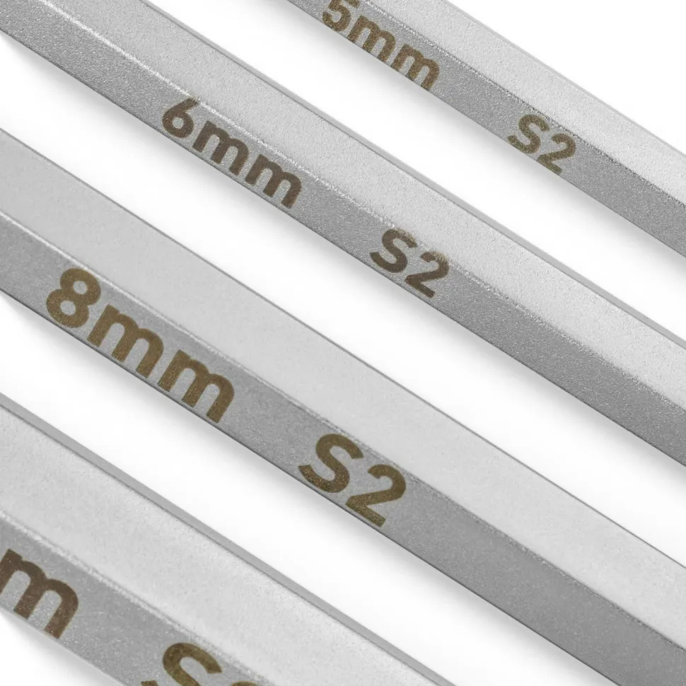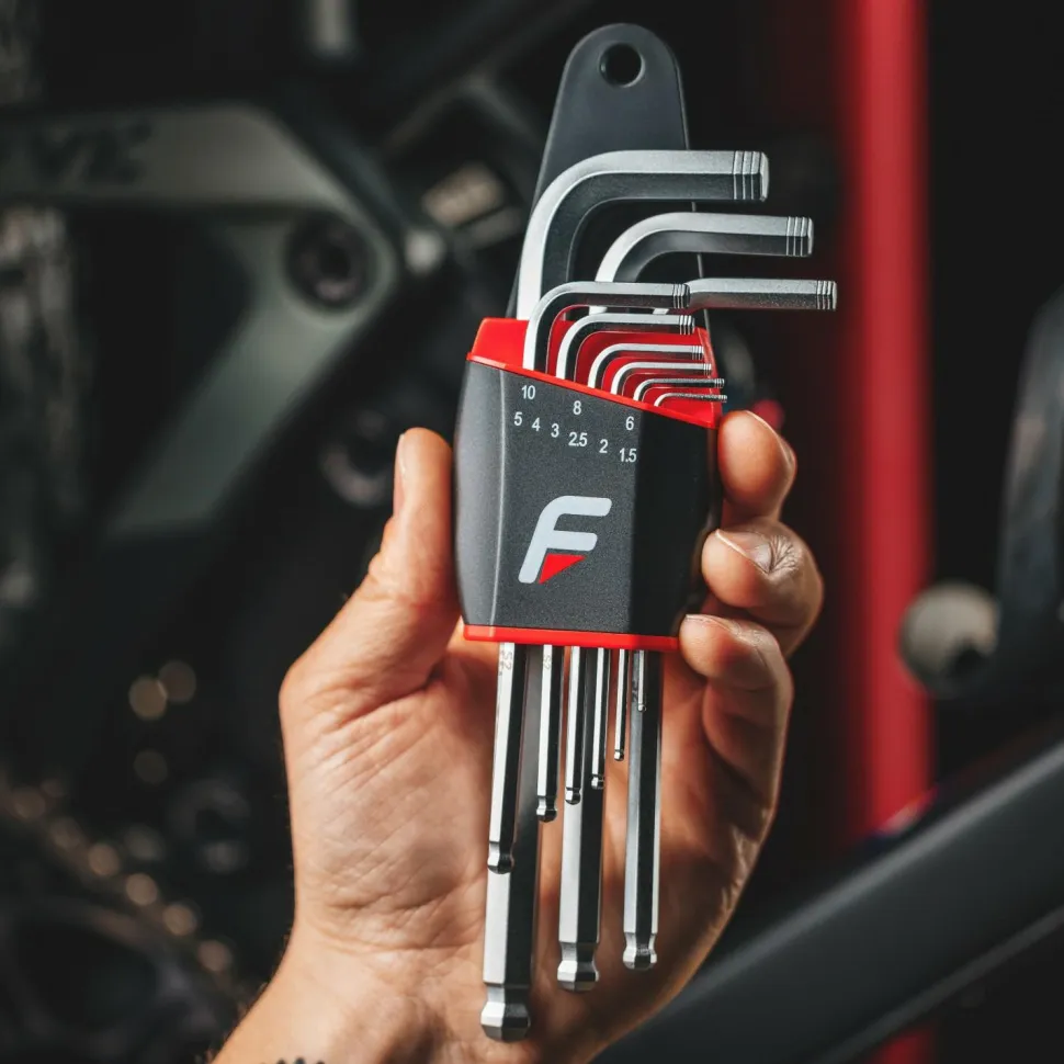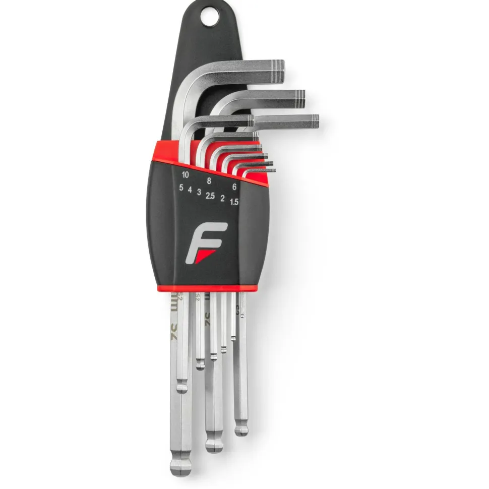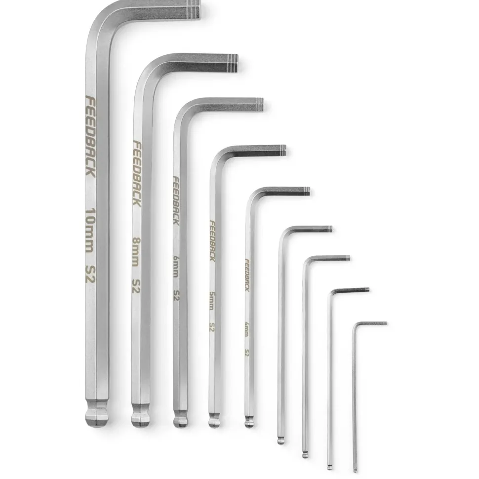 Der Innensechskant-Satz von Feedback Sports umfasst 9 metrische Schlüssel von 1,5–10 mm und deckt damit alle gängigen Größen ab. Gefertigt aus S2-Stahl bieten sie hohe Haltbarkeit, während gerippte Köpfe und facettierte Kugelköpfe sicheren Halt auch in engen Winkeln ermöglichen. Jede Schlüsselgröße ist lasergraviert und magnetisiert. Das robuste Etui sorgt für eine übersichtliche, praktische Aufbewahrung.