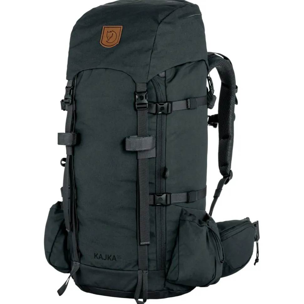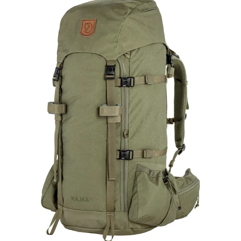 Das geräumige Innenfach lässt sich sowohl von oben als auch über einen Reißverschluss auf der Vorderseite erreichen. Das Deckelfach ist mit drei Reißverschlusstaschen ausgestattet und lässt sich bei Bedarf abnehmen, um es als Daypack zu nutzen. Eispickel oder Wanderstöcke lassen sich bequem außen am Trekkingrucksack befestigen. Die beiden Seitentaschen lassen sich verschließen und eignen sich ideal für Trinkflaschen oder andere Ausrüstung. Seitliche Kompressionsriemen und die mitgelieferte Regenhülle mit reflektierendem Details machen den Fjällräven Kajka 35 zur ersten Wahl für anspruchsvolle Touren in der Natur.