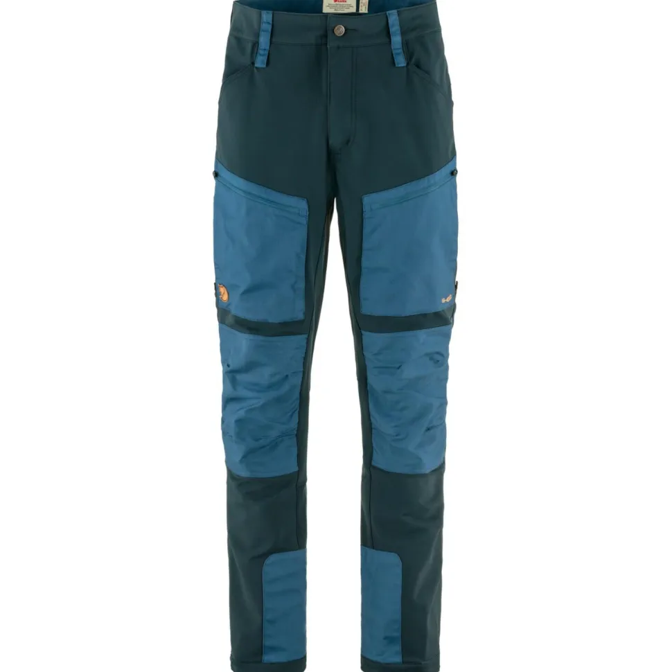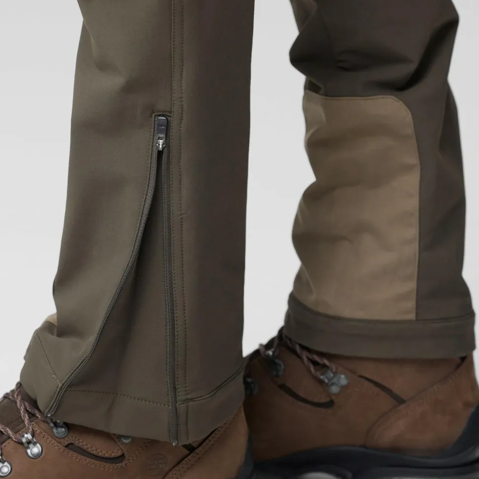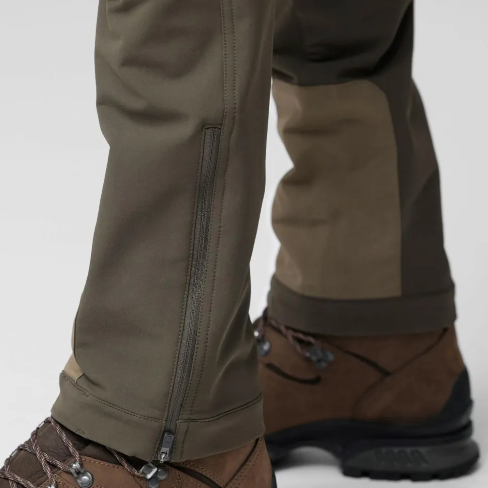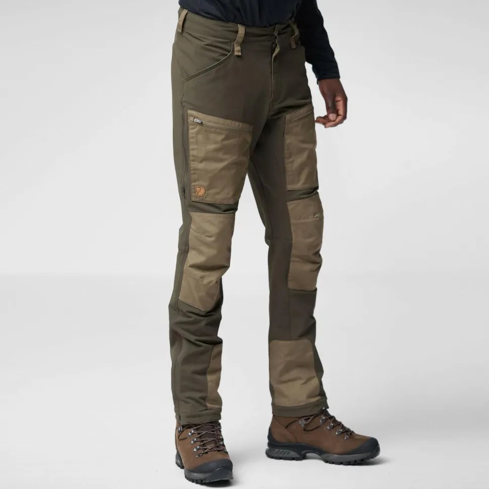 Die Hose besteht aus wunderbar weichem Softshell-Material mit hohem Stretchanteil und ist mit einer wasserabweisenden DWR-Imprägnierung versehen. Dadurch bietet sie einen hohen Tragekomfort und guten Schutz vor Nässe und Nieselregen. Der Schnitt ist weit genug, um an sehr kalten Tagen das Tragen einer zusätzlichen langen Unterhose zu ermöglichen. Besonders beanspruchte Stellen sind mit dem für Fjällräven typischen G-1000 Eco verstärkt. Dieses Material aus Bio-Baumwolle und recyceltem Polyester ist extrem strapazierfähig und macht die Hose noch robuster.