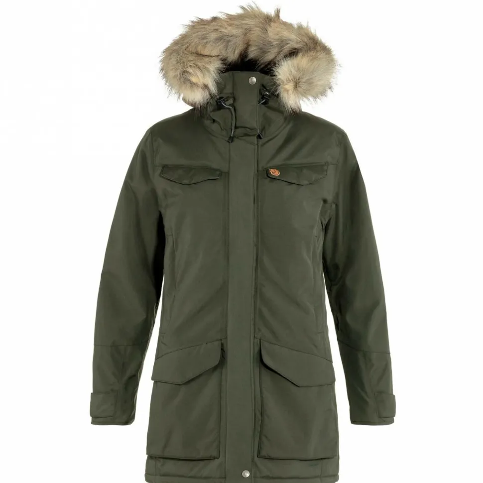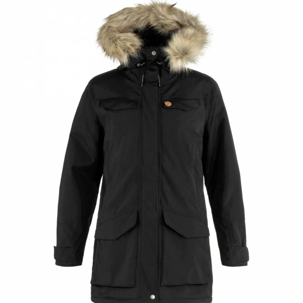 Der Women’s Nuuk Parka von Fjällräven ist ein treuer Begleiter für die kalten Tage. Mit seiner coolen und stylischen Optik verleiht er Dir einen angesagten Look und punktet gleichzeitig mit einer ganzen Reihe an nützlichen Features. Angefangen mit seinen wärmenden Materialien: diese sorgen dafür, dass Du auch bei Minusgraden nicht frierst. Sie isolieren die Körperwärme gekonnt und lassen in Sachen Gemütlichkeit im Innern der Jacke nichts anbrennen. Damit auch der empfindliche Kopfbereich bei Wind und Wetter geschützt werden kann, ist der Parka mit einer Kapuze ausgestattet. Sie kann schnell und einfach mit einem Kordelzug und einem Schirm auf die gewünschte Passform eingestellt werden.