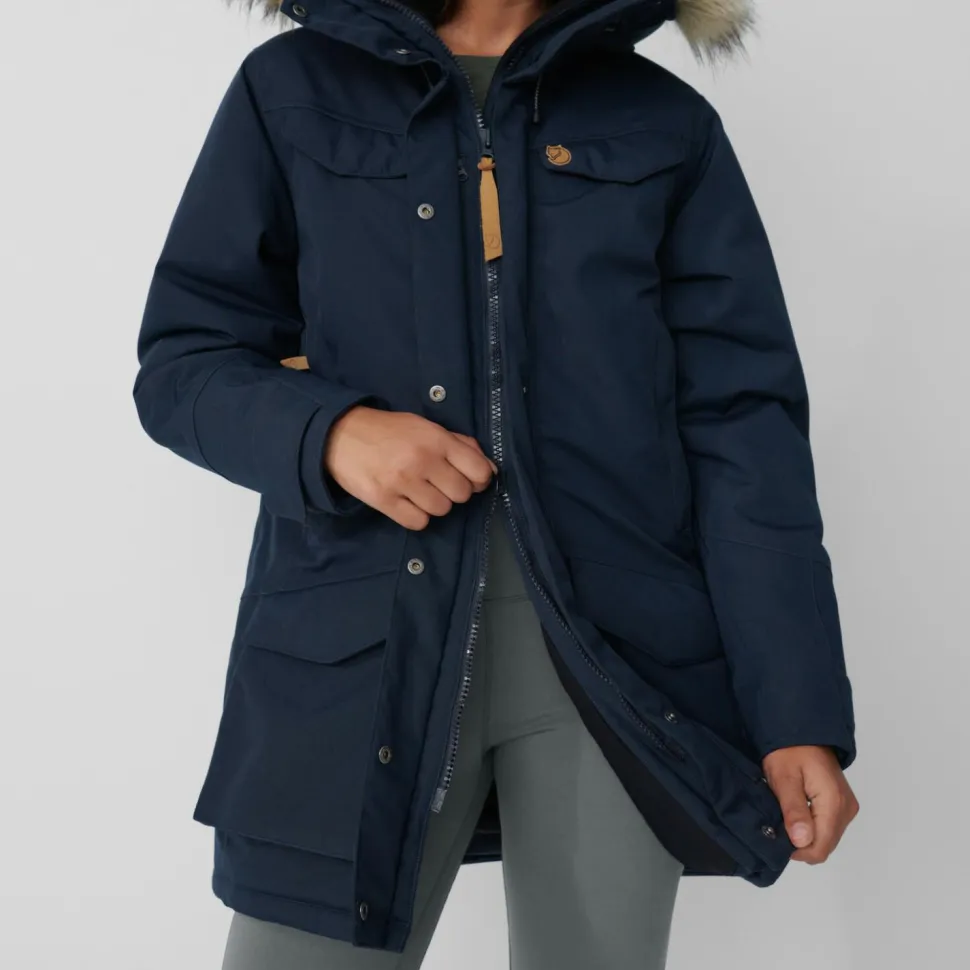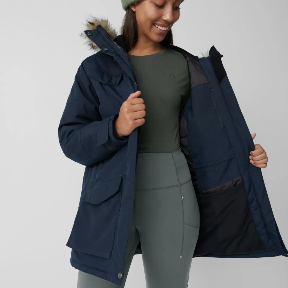Damit Du auch bei sehr schlechtem Wetter geschützt durch den Alltag kommst, ist der Women’s Nuuk Parka von Fjällräven mit sehr robusten Materialien ausgestattet. Diese verhindern das Eindringen von Wind und Nässe. Eine Besonderheit der Jacke sind zudem die enorm vielen Verstaumöglichkeiten. Eine Vielzahl an Taschen auf der Innen- und Außenseite des Parkas macht es möglich, die wichtigsten Kleinigkeiten immer dabei zu haben. Auch frierende Hände finden in den Taschen einen warmen Zufluchtsort vor dem Winter.