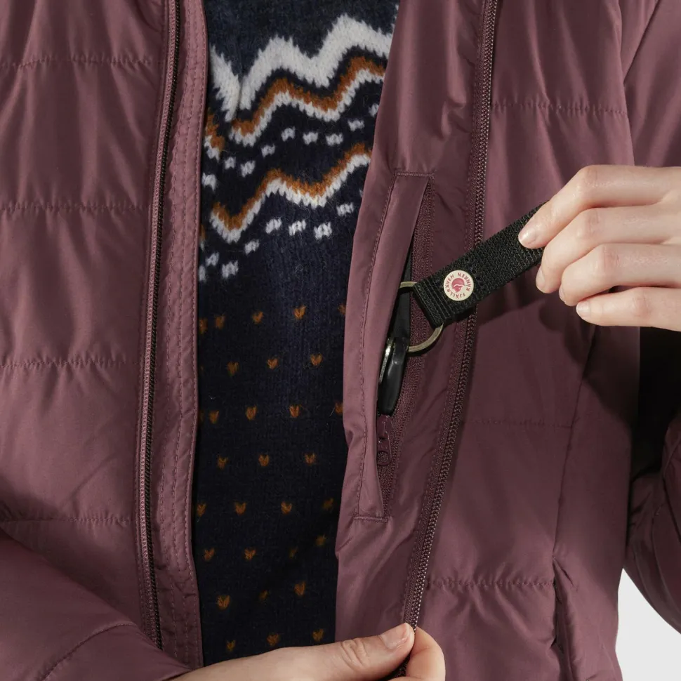 Die Innenjacke wärmt mit ihrer 120 g/m² starken Isolationsschicht aus wattierter Kunstfaser, die Fjällräven komplett aus recycelten Rohstoffen gewinnt. Innen- und Außenjacke verfügen über praktische Taschen und können per Reißverschluss im Handumdrehen zu einer Jacke verbunden werden.