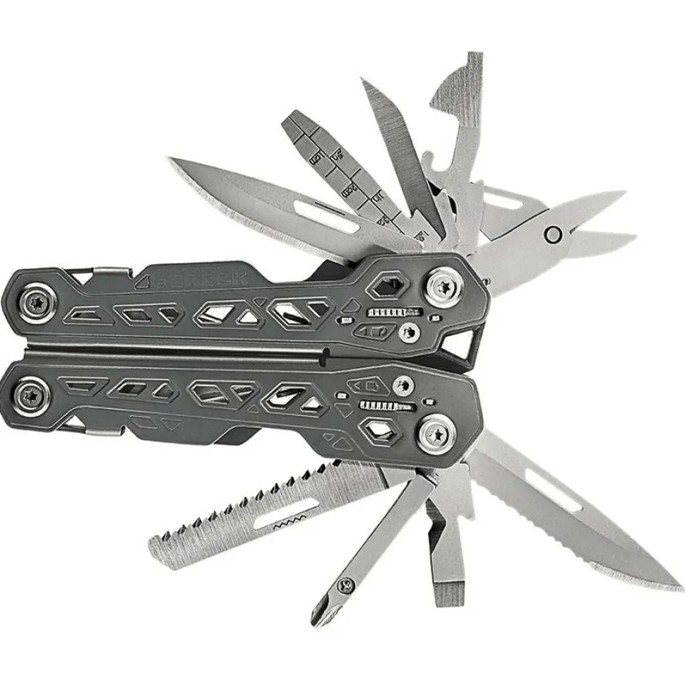 Das Multi-Tool Truss von Gerber ist kompakt und zugleich ein Riese in puncto Funktionalität: 17 Funktionen beherbergt das Tool. Im geschlossenen Zustand liegen die Werkzeuge außen für schnellen Zugriff. Alle Werkzeuge arretieren für hohe Sicherheit bei der Verwendung. Zum Lieferumfang gehört ein Nylonetui, das längs oder quer befestigt werden kann. 17 Funktionen: Spitzzange, normale Zange, Drahtschneider, glatte Klinge, Klinge mit Wellenschliff, Säge, Schere, kleiner/mittlerer/großer Flachschraubenzieher, Kreuzschraubendreher, Lineal, Feile, Abisolierer, Ahle, Dosenöffner, Kapselheber.