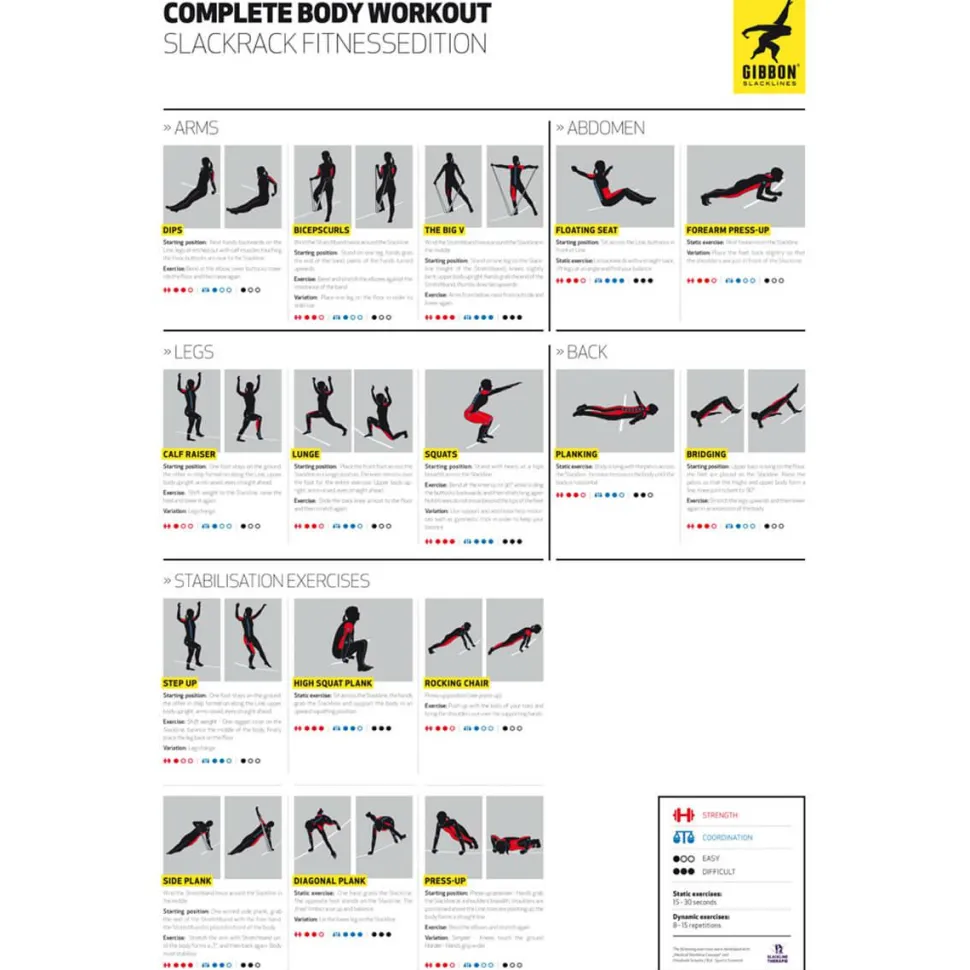 Ideal für Fitnessübungen aller Art: die Gibbon Slacklines Slack Rack Fitnessedition! Das Slackline-Set besteht aus einem hochwertigen Metallgestell, einer Fitness Slackline, einer Ratsche mit Rücksicherung, Schutzkappen sowie einer Aufbauanleitung und der Slack-App. Zudem enthält das Set die Fitness-Tools Stretchband, Handgriffe und ein Poster mit verschiedenen Übungen für die Slackline! Das robuste Gestell kann entweder mit 2 oder 3 Metern Länge aufgebaut werden und steht durch die Gummifüße sicher auf dem Boden. Die Fixierplatten sind mit einem Schraubentyp anzubringen und somit einfach aufbaubar! Perfekt für den Einsatz im Fitness oder Sporttherapiebereich: die Slack Rack Fitnessedition.
