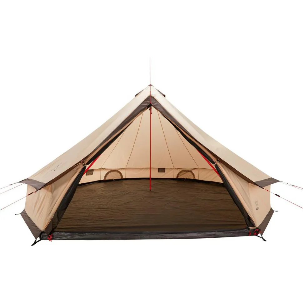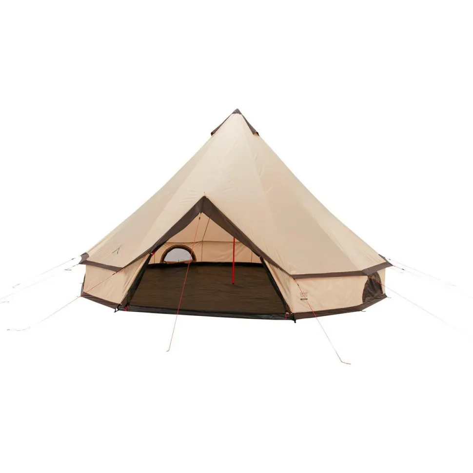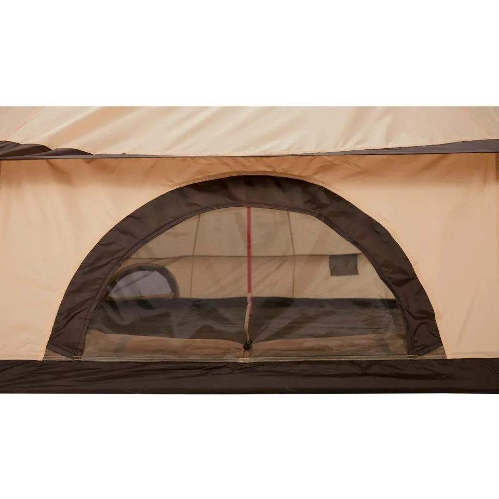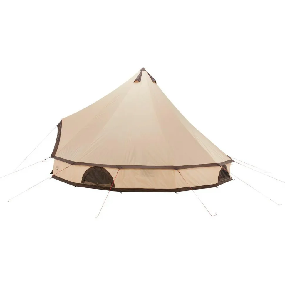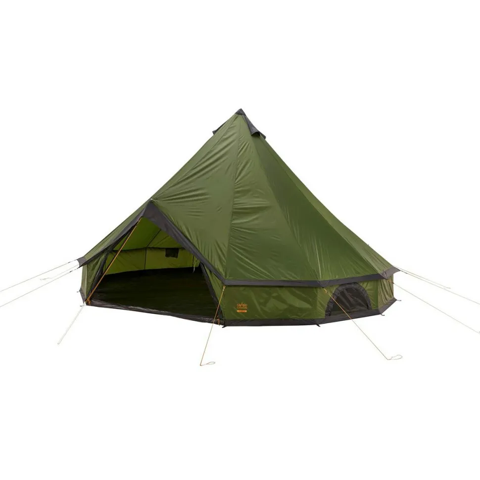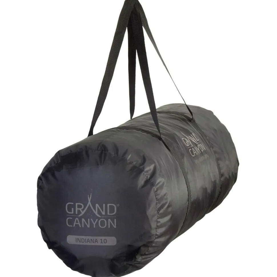 Grand Canyon fertigt das Indiana 10 Gruppenzelt aus 68D 190T Polyester und beschichtet den strapazierfähigen Zeltstoff mit wasserdichtem PU. So widersteht die Außenhülle einer 3000 mm Wassersäule und schütz im Zelt zuverlässig vor Nässe und Regen. Gleichzeitig sorgen die seitlichen Fenster mit Moskitonetz für angenehme Ventilation. Der Zeltboden aus Polyethylen ist ebenfalls PU-beschichtet und hält einer 4000 mm Wassersäule stand. Getragen wird das hohe Zelt von robusten Zeltstangen aus Stahl. Mit Stahlheringen und reflektierenden Abspannleinen wird das Indiana 10 am Boden fest fixiert. Fertig gepackt für den Transport wird das Zelt auf sparsame 22 x 76 cm komprimiert.