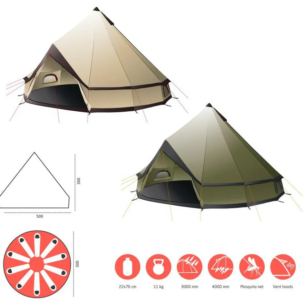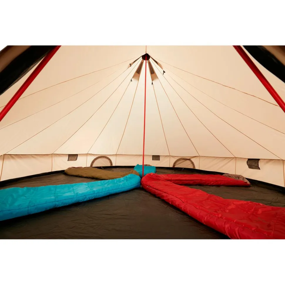 Ob Jugendzeltlager, Fußballmannschaft oder Reisegruppe – im Indiana 10 Gruppenzelt von Grand Canyon ist mehr als genügend Platz vorhanden. Dabei bietet das riesige Tipi nicht nur 10 Personen Platz zum Schlafen, Liegen und Sitzen, sondern hält auch noch genügend Platzreserven für die nötige Ausrüstung und eine Menge Equipment bereit. Mit 5 m Durchmesser und 3 m Höhe lässt es sich im großen Gruppenzelt bequem aufrecht laufen. Gleichzeitig sorgt das Indiana 10 für perfekten Schutz vor Wind und Regen und lässt sich mit nur 11 kg Gesamtgewicht gut transportieren. Mit umgerechnet 1,1 kg Gewicht pro Person ist das Riesenzelt mit seinen modernen Materialien ausgesprochen leicht.