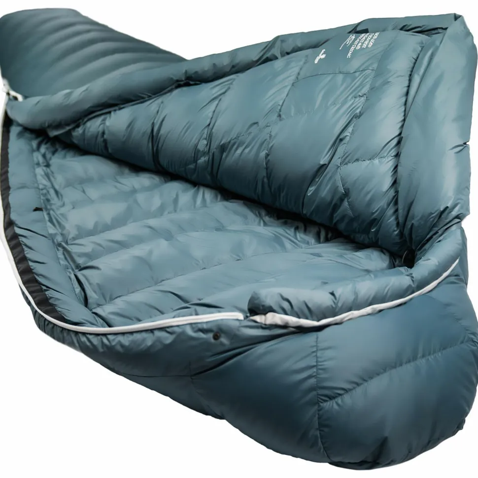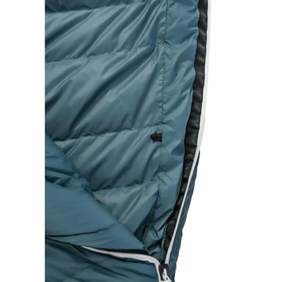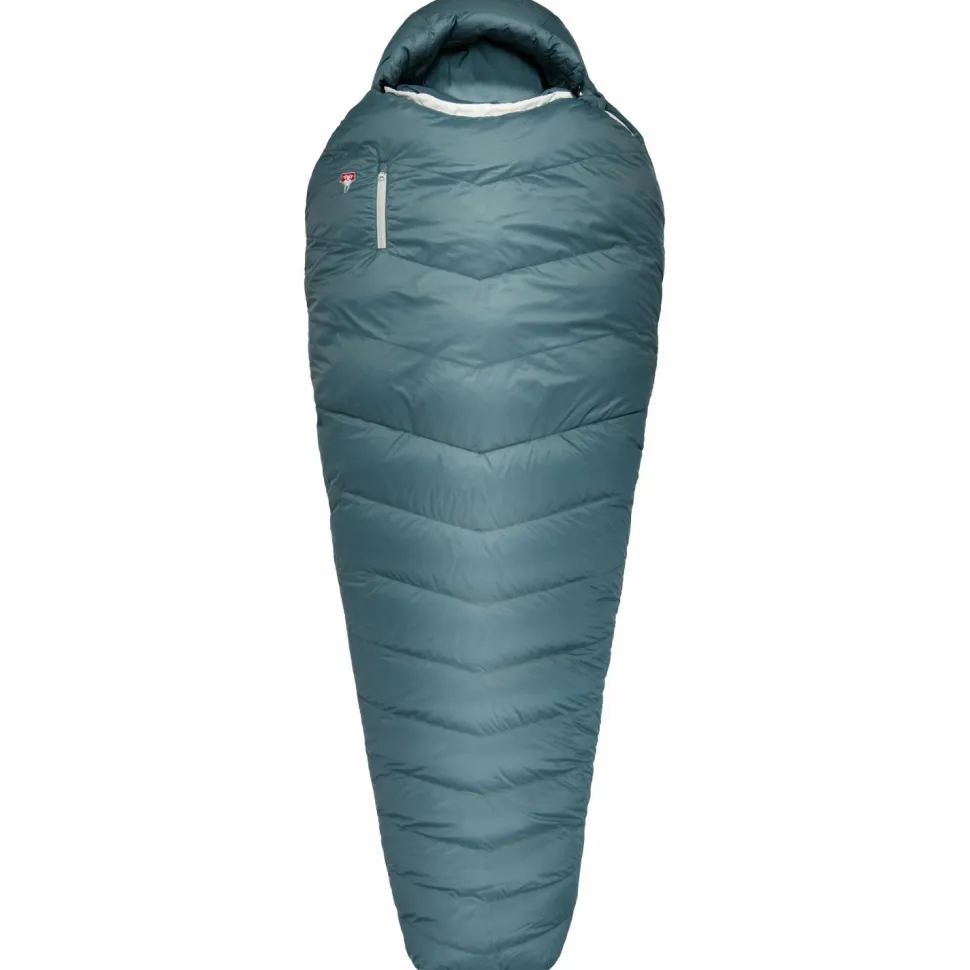 Außerdem ist der Schlafsack etwas weiter geschnitten. Das hat den Vorteil, dass sich die Füllung weniger stark komprimiert und die Isolationsleistung dadurch verbessert wird. Die aufwendige H-Kammer-Konstruktion wird an kälteempfindlichen Körperzonen durch noch stärker gefüllte Boxkammern unterstützt. Auf der Oberseite sind die Kammern in V-Shape angeordnet.