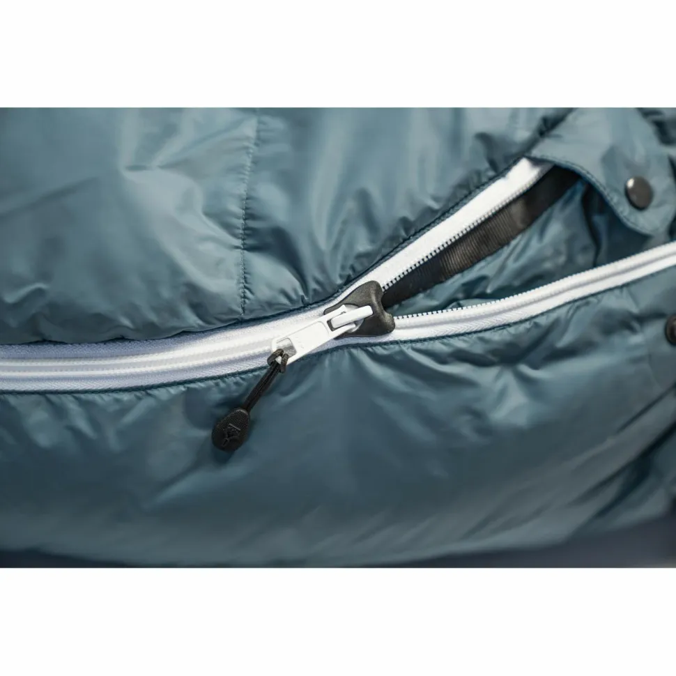 Mit seinen vielen Details wird der Schlafsack zum praktischen Begleiter. Die Kapuze lässt sich einstellen und das Facebaffle bildet einen weichen Isolationsübergang zum Gesicht. Zusammen mit dem Wärmekragen bleibt die angestaute Körperwärme da wo man sich braucht und zwar im Inneren des Schlafsacks. In der Innentasche und in der Außentasche können kleinere Sachen körpernah und griffbereit verstaut werden. Praktisch sind auch die Anti-Rutsch-Noppen auf der Schlafsackunterseite, die ein Wegrutschen von der Isomatte verhindern.