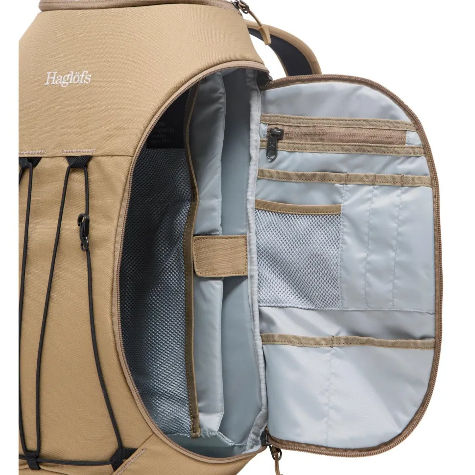Ein hochwertiger und praktischer Tagesrucksack aus recycelten Materialien: der Corker 15 von Haglöfs. Das Hauptfach ist über eine große, seitliche Reißverschluss-Öffnung zugänglich, sodass der Inhalt schnell griffbereit ist und man einen guten Überblick hat. Ein internes Organizer-Fach sorgt für zusätzliche Ordnung und das Tablet kommt in eine vom Hauptfach erreichbare Reißverschlusstasche. In der elastischen Seitentasche kann eine Trinkflasche verstaut werden und die Jacke wird außen an einer Gummizughalterung befestigt. Eine umweltfreundliche DWR-Imprägnierung sowie reflektierende Elemente runden den Corker 15 ab.