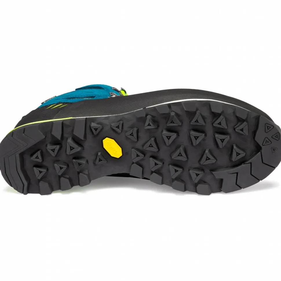 Die Sohlenkonstruktion ist ebenfalls überaus stabil und verwindungssteif, überrascht aber zugleich durch ein geringes Gewicht. Sie sorgt für ein ausgewogenes Verhältnis von Stabilität und Leichtigkeit. Die Vibram-Makra-Laufsohle gibt Dir einen guten Halt auch auf schwierigem Untergrund. Die Zwischensohle ist ein Mix aus PU, TPU und EVA. Sie dämpft Deine Schritte komfortabel und je nach Fußbereich unterschiedlich. So garantiert sie Präzision im vorderen Teil und Komfort im Fersenbereich. Ideal für technische Touren mit etwas mehr Gepäck. Die Alpine Wide-Leiste ist durch einen breiteren Vorfußbereich gekennzeichnet. Dadurch bleiben die Schuhe auch auf langen Strecken bequem.