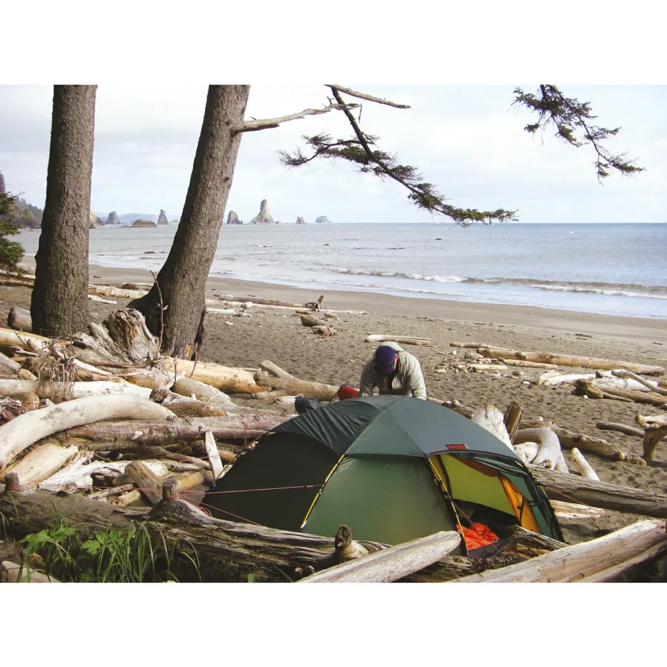 Schon auf den ersten Blick wird beim Allak 3 von Hilleberg klar, dass man es hier mit einem echten Profi unter den Trekking-Zelten zu tun hat. Ob zum Wandern, Trekking, Boot-Fahren oder auf Wintereinsätzen. Das Zelt eignet sich für den ganzjährigen Einsatz und kennt bei der Aktivitäten-Auswahl nahezu keine Grenzen. Der große Vorteil des Zelts sind neben seinen zwei geräumigen Eingängen, dass es von alleine stehen kann und keine Heringe nötig sind, um dem Zelt einen stabilen und sicheren Stand zu ermöglichen.Somit ist es mit nur 3 Stangen in Kurzzeit aufzubauen. Das geräumige Innenleben des Zelts bietet angenehmen Platz für drei Personen, die durch die funktionalen Materialien vor Wind und Wetter geschützt werden. Durch die beiden Eingänge ist man nicht nur Standortflexibel und unabhängig, sondern hat gleichzeitig auch eine hervorragende Belüftungsmöglichkeit.Die integrierten Apsiden sind parallel zum Schlafbereich angeordnet. So ist das Gepäck leicht erreichbar und der Ein-und Ausstieg besonders leicht. Durch die Kopplung von Innen- und Außenzelt wird der Auf- und Abbau extrem beschleunigt. Die stabile Kuppelkonstruktion ist sehr robust gegen Wind und bietet eine geringe Angriffsfläche. Zudem hält es so bei einem Wintereinsatz auch größeren Schneemengen problemlos Stand. Das Außenzelt ist so geschnitten, dass es bis zum Boden reicht. Zusätzlich sind sie mit Zugschlaufen versehen, die nach Belieben eingestellt werden können. Die Türen sind zusätzlich mit Moskitonetzen ausgestattet, was eine Belüftung ohne nervige kleine Besucher ermöglicht.
