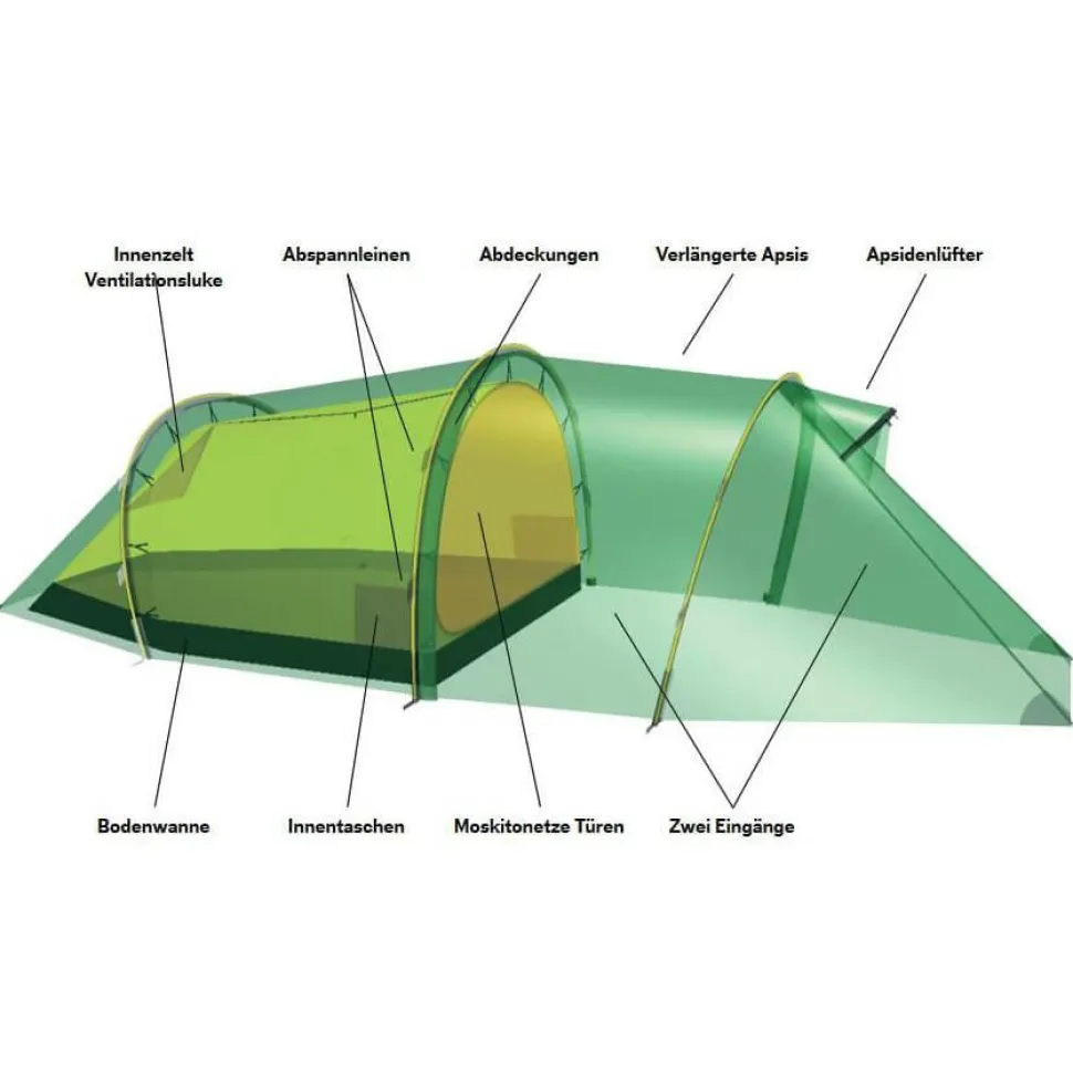 Das Außenzelt ist bis zum Boden geschnitten, die Ventilation wird durch Lüftungshutzen im Dachbereich gewährleistet. So bleibt das Zeltinnere auch bei länger anhaltenden Regenschauern zuverlässig trocken und das Gepäck ist in der Apside sicher verstaut. Es besteht aus dem bewährten Kerlon 1200, einem Nylon-Ripstop -Material mit einer Weiterreißfestigkeit von beachtlichen 12 kg. Für Wasserdichtigkeit und eine hohe UV-Stabilität sorgt die hochwertige Silikonbeschichtung. Dank der Ripstop-Verarbeitung wird auch das Nachdehnen des Nylonstoffs bei Nässe reduziert – es gibt nichts Unangenehmeres, als bei strömendem Regen um das Zelt zu laufen und Schnüre nachzuspannen. Auch beim Gestänge wurden keine Kompromisse eingegangen – sie stammen vom Markenhersteller DAC.
