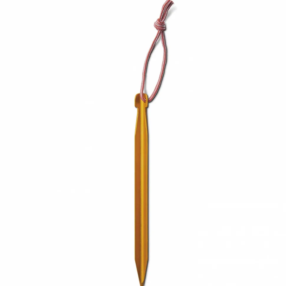 Der V-Peg von Hilleberg ist leicht und robust. Durch die V-Form lässt er sich gut in harte Böden einschlagen und bietet auch in losen Untergründen einen guten Halt. Er ist besonders verwindungssteif und kann dank der auffälligen Farbe gut gesehen werden. Die angebrachte Schlaufe erleichtert das Herausziehen aus dem Boden.