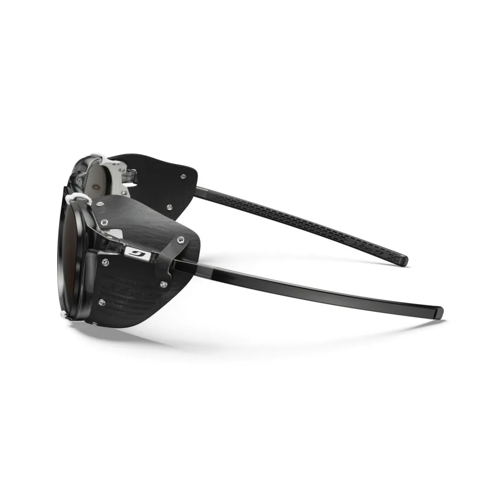 Sieht gut aus und kann was, die Millenium Reactiv Polarized S2-4 (VLT 5-20%) von Julbo. Diese Gletscherbrille wurde in erster Linie auf die Verwendung im Hochgebirge ausgelegt, kann aber auch darüber hinaus punkten. Der Rahmen ist dabei äußerst robust und sitzt aufgrund der beschichteten und gewölbten Bügel immer sicher und angenehm. Die abnehmbaren Seitenteile sorgen zuverlässig dafür, dass kein grelles Licht hinter die Brille gelangt. Die Gläser sind bei diesem Modell selbsttönend und entsprechen je nach Lichtintensität den Schutzklassen 2-4.