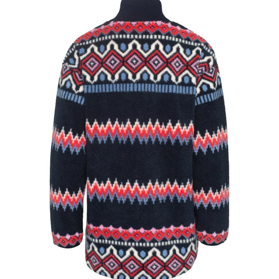 Die Women’s Ruthie Midlayer Half Zip Fleecejacke von Kari Traa ist ein echter Eyecatcher!Das auffallende ethnografische Muster passt super zum lässig-weiten Schnitt der Jacke.Weich und kuschelig schmiegt sich das Material an den Körper, zusätzlichen Kälteschutz bietet der verlängerte Rücken, der hohe, gerippte Kragen und die elastischen Ärmelbündchen. Der Umwelt zuliebe besteht die Jacke zu mindestens 50% aus recyceltem Polyester.