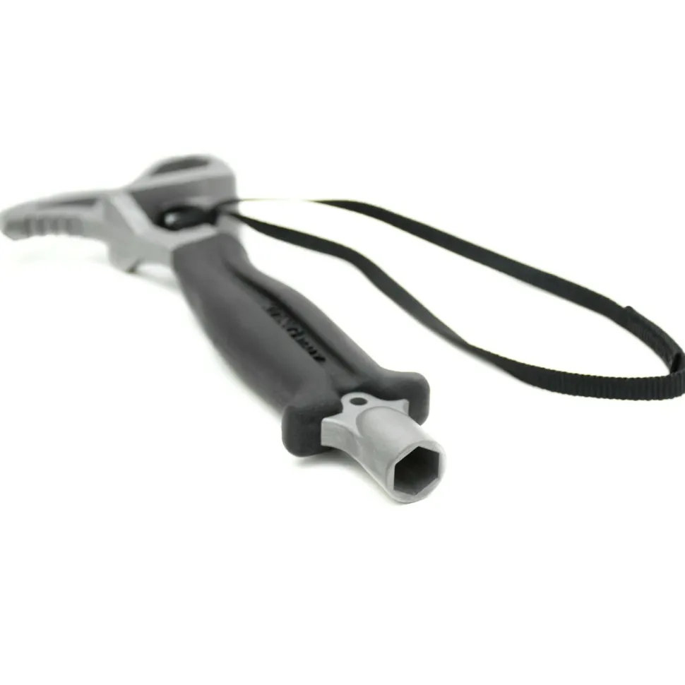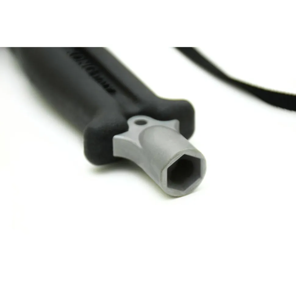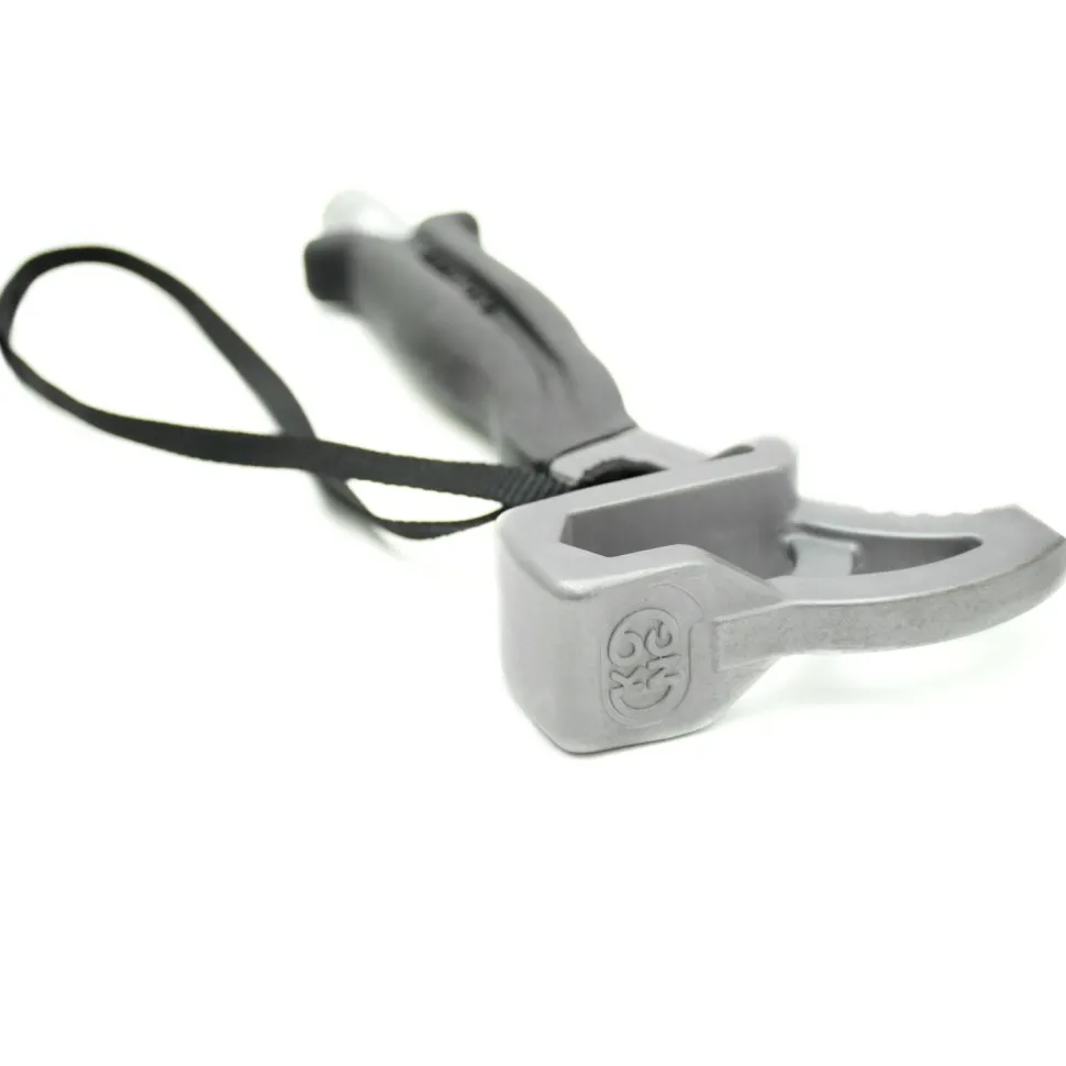 Die Form des Kopfes mit Adlerschnabel, gezahnter Unterseite und großen Aussparungen ermöglicht zudem, den Hammer als Hebel einzusetzen. Der Speleagle von Kong kommt zusätzlich mit einen ergonomischen Griff mitsamt dicker Gummieinfassung daher, um Hand und Finger zu schützen. Unten verfügt er über einen Sechskant-Innenschlüssel für 13er und 17er Nuts.