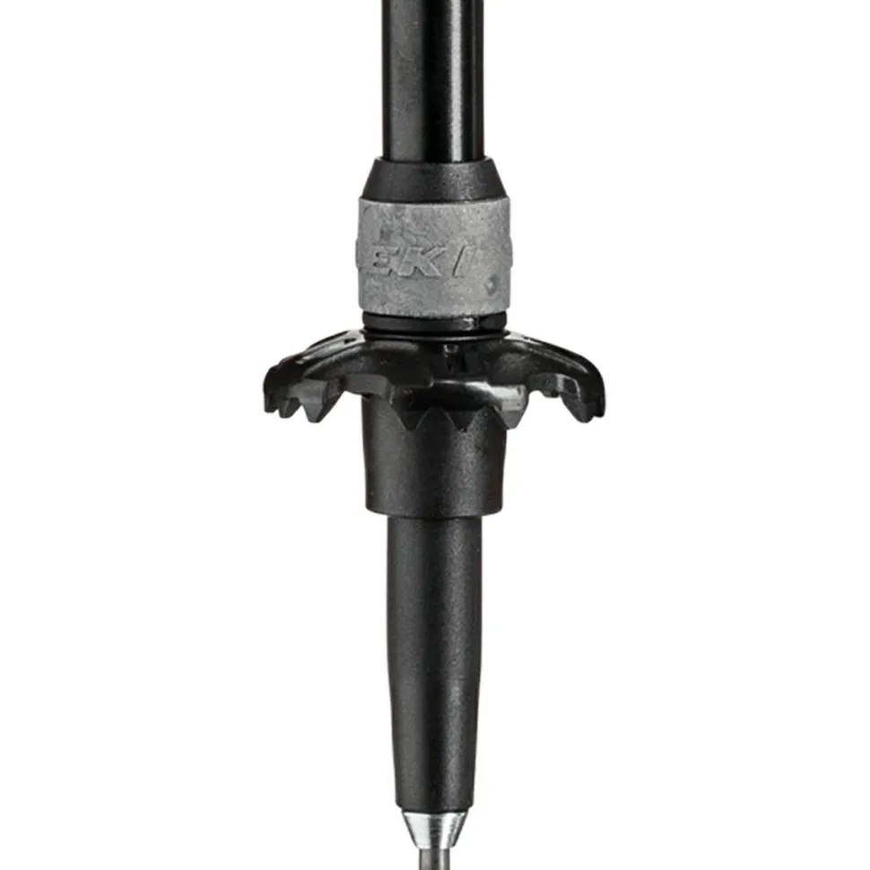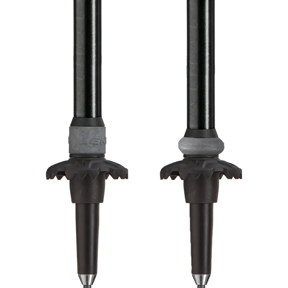 Damit die Stöcke auf jedem Untergrund sicher halten und nicht wegrutschen, sind sie mit einer robusten Spitze ausgestattet. Um Gelenke und Muskulatur zu schonen, ist die Spitze gefedert, sodass Schläge und Stöße absorbiert werden. Zudem sind Trekkingteller montiert. Die Handgelenk-Schlaufen am Griff der Stöcke verhindern, dass diese auf den Trail purzeln und ermöglichen eine direkte Kraftübertragung.