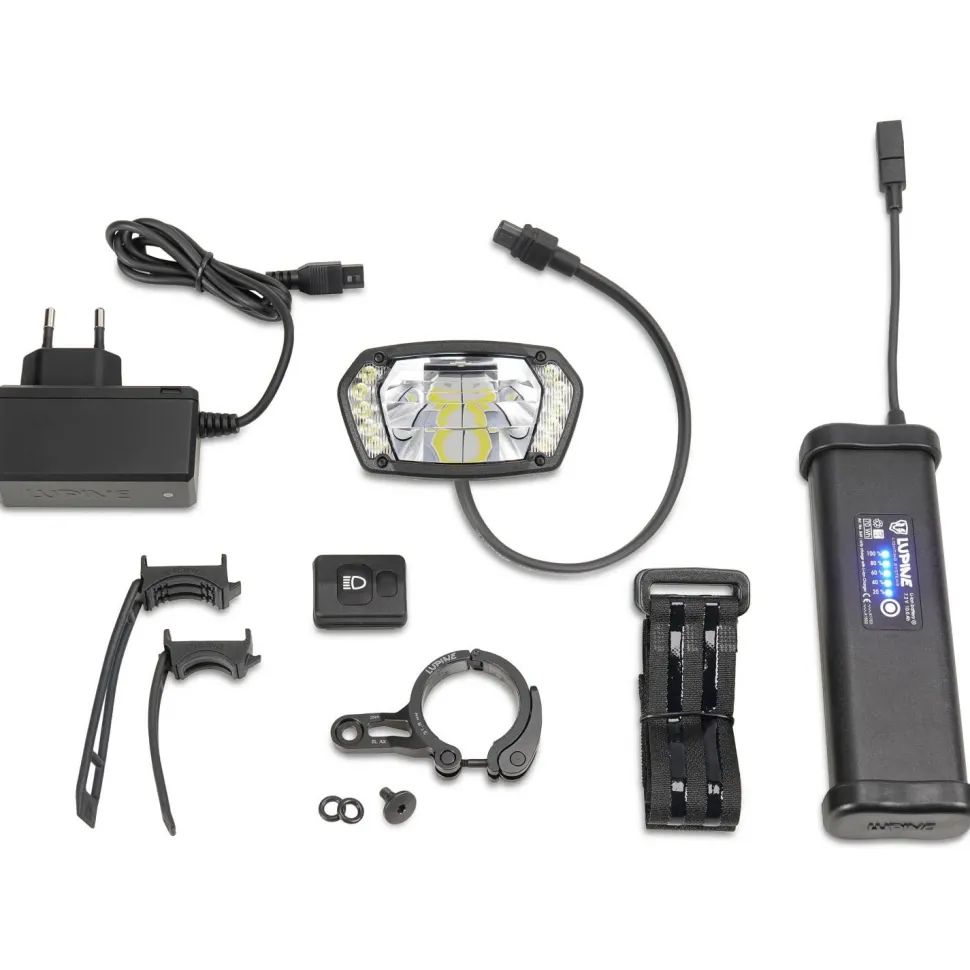 - SL AX Lampenkopf; 13.8 Ah SmartCore Akku; Wiesel Ladegerät; Schnellspanner; Bluetooth-Fernbedienung; Halter Fernbedienung Peppi V5 & Peppi V5 XL; Klettband beschichtet lang & kurz; Anleitung