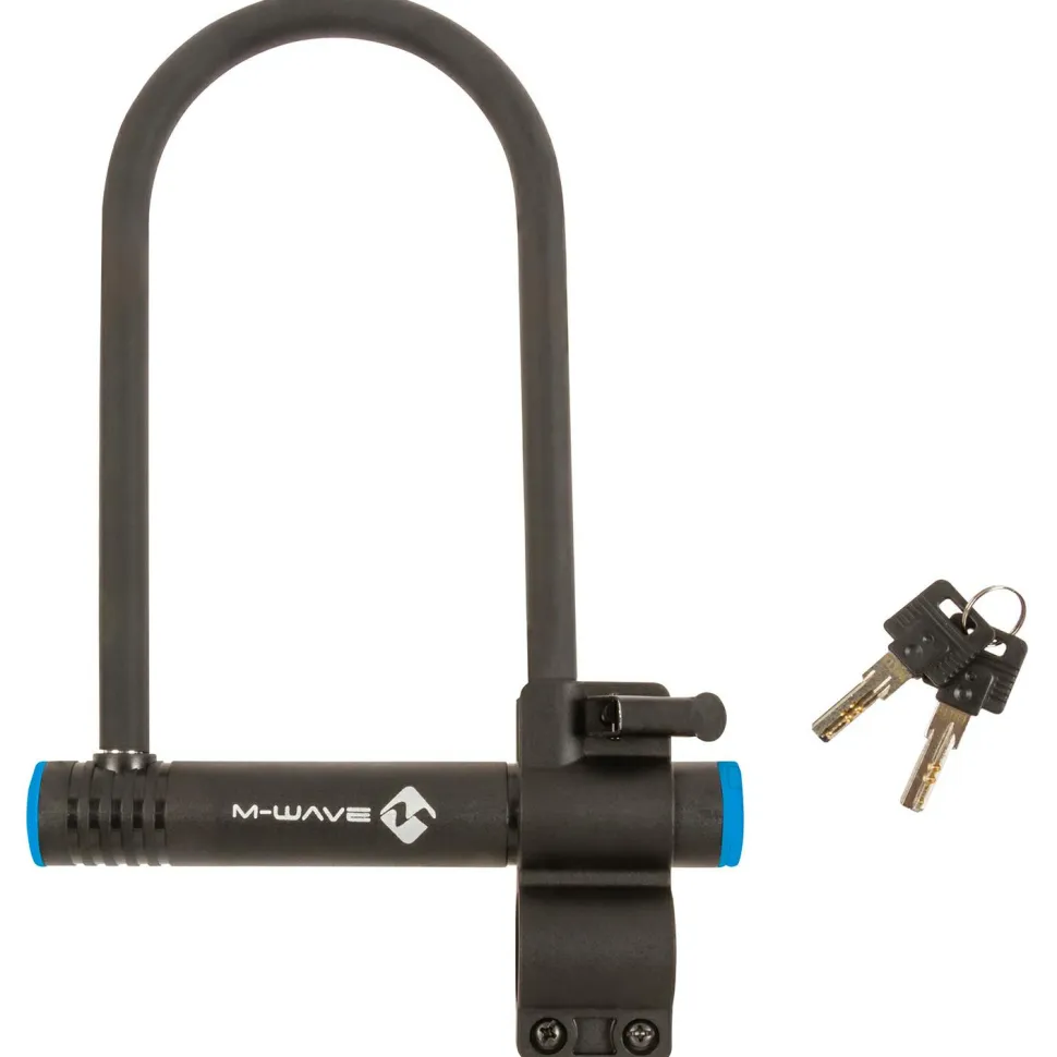 Das Bügelschloss B 245 von M-Wave macht potenziellen Dieben das Leben schwer. Öffnen bzw. schließen lässt sich das Schloss ganz einfach mit einem der computerdesignten Schlüssel. Das Schlüsselloch befindet sich zum Schutz sicher geborgen hinter einer Staubschutzklappe. Einfach den mitgelieferten Halter am Fahrrad montieren, das Fahrradschloss daran festmachen, und es kann losgehen.